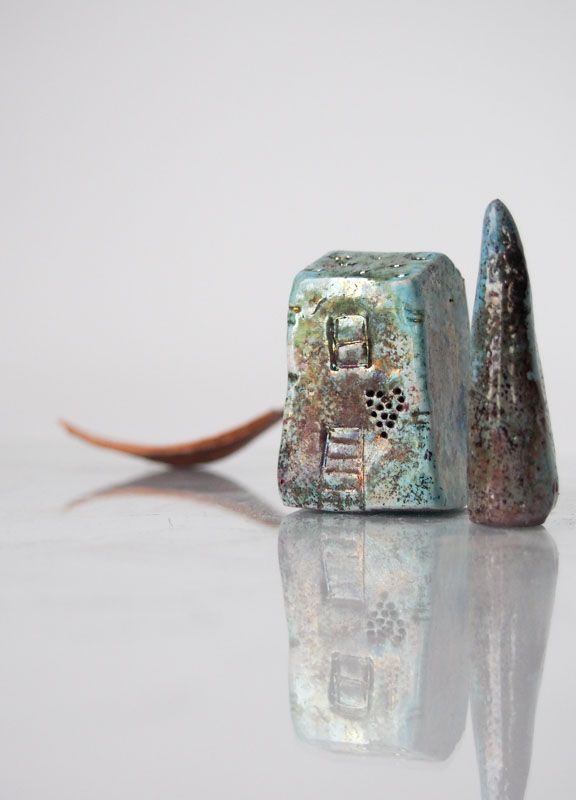 Raku pottery fired Ceramic house, Hand sculputed house with beautiful colours which changes with lights on it is perfect for a ulittle nook of the house. Raku glazes contain a lot of copper that gives the fired pieces beautiful green, silver, and gold shades. Hand sculpted and raku or earthenware fired. It is unique and collectibles. With this listing you will receive one (1) house Each house is hand formed and no molds are used, so no two will be exactly the same. This handmade item may have some unique features which makes it all the more special. Each house and tree set comes with a special organza bag, which also serves as a lovely and decorative gift wrap ready for giving or keeping