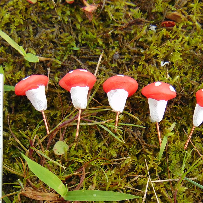 These tiny mushrooms are just what you need to add color to your fairy garden or succulent garden! Each one was individually hand sculpted and painted and has a copper wire post on the bottom perfect for standing the mushrooms up in soil or moss. Each mushroom is about 0.5 in. tall. This set of 6 mushrooms comes in a reusable cloth drawstring bag perfect for gifting. https://www.etsy.com/shop/SolarCrush