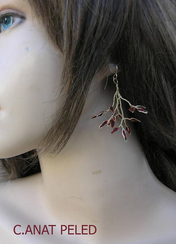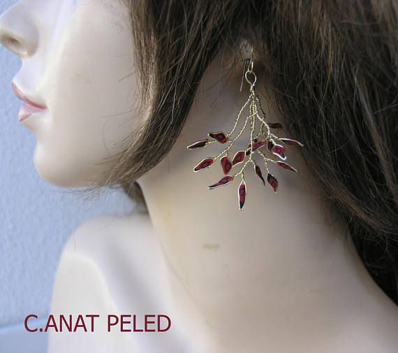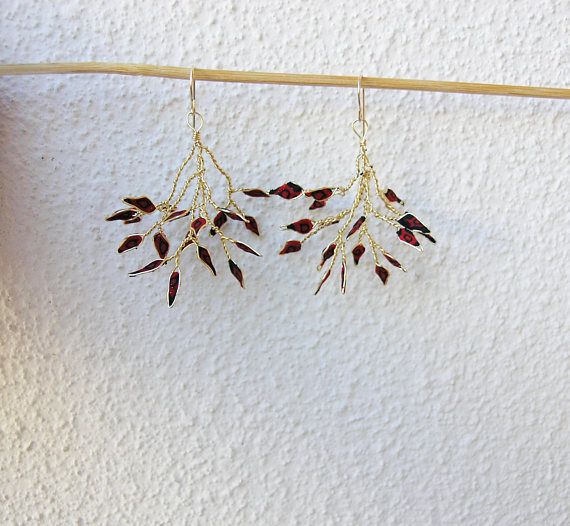 3d earrings like a real branch with small red leaves. Hanged from a healthy gold filled ear wire, it is a gold plated copper wire work, that captured a polymer handmade Millefiori work. I am selling on Etsy on line shop: https://www.etsy.com/il-en/shop/anaodesign?ref=seller-platform-mcnav Length:~2.4"[4.8cm] Width:~1.6"[3.2cm]