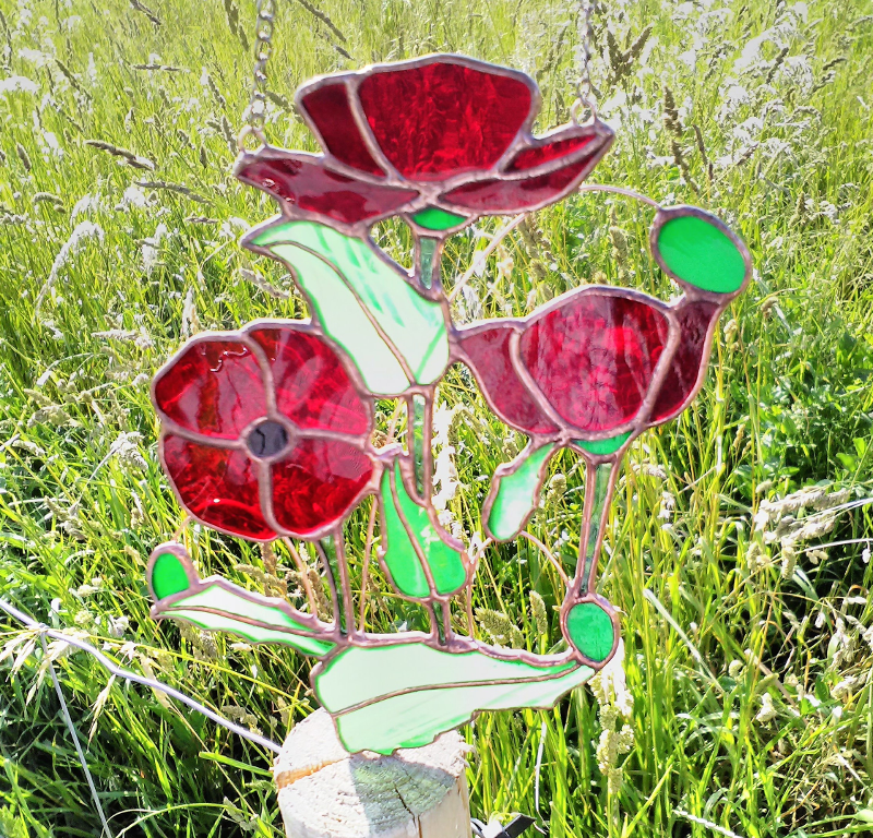 Bright red poppy suncatcher window decoration. These gorgeous red poppies will catch the sun's rays and brighten up your home the whole year round - even on a cloudy day, they look lovely. 🎁 GIFT IDEA This would be a stunning present for a couple celebrating their 40th Ruby Anniversary. 🎁 Your suncatcher will come in a display gift box. • SIZE 17 x 13.5cm (6+3/4" x 5+1/4") • There are TWO RED options - textured transparent cherry red, and wispy red (which is more opaque and orange-red in the denser areas). • Other flowers and colours can be created into suncatchers - just ask. • All the solder lines can be left silver in colour or in a copper or black patina. • It has a chain attached for hanging and comes with a screw-in hook and a window sucker-hook (lightly moisten the sucker before adhering to a window - I recommend using the secure screw in hook to the window frame if possible). ⏳ As it's a made to order item, please allow 7-10 days for production. ✨ Quality craftsmanship from a qualified designer with thirty years' experience. 🛃 Please note that this item ships from the Czech Republic (EU) and all customs and tax duties, to non EU countries, are the responsibility of the buyer. Thank you for understanding.