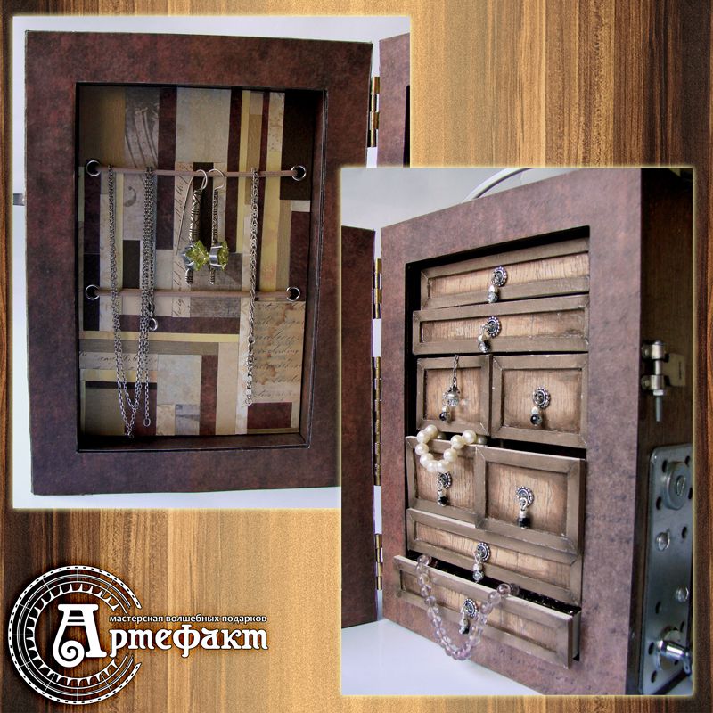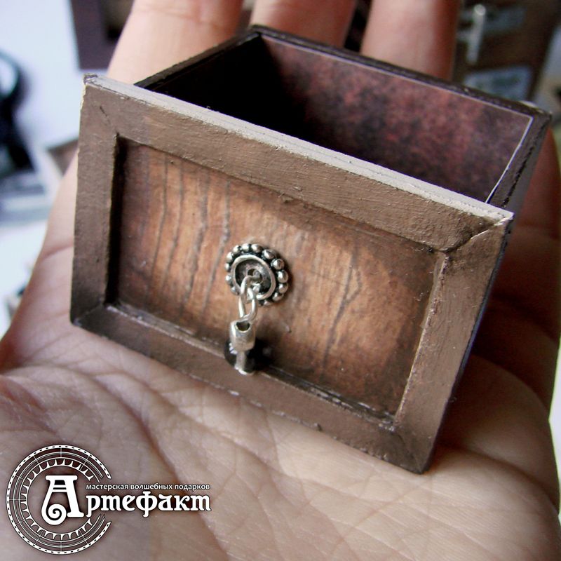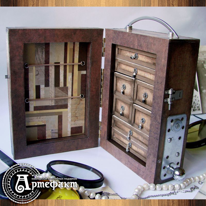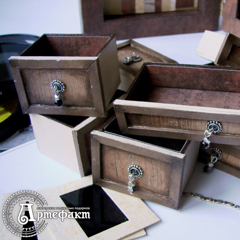 This small chest of drawers was inspired by the old cameras, Gilles-Faller Chambre from theSylvain Halgand collection in particular. It's made of braided cardboard (thickness 1,75 mm). This item is tinted with the pastel and covered with craquelure finish. The inner panel is made of scrap paper in mosaic style. This item has eight drawers for stocking jewellery and other stuff. This chest of drawers is unique and can't be redone. Size: 145х200х80mm Drawers 42х34х30mm and 94х34х15mm