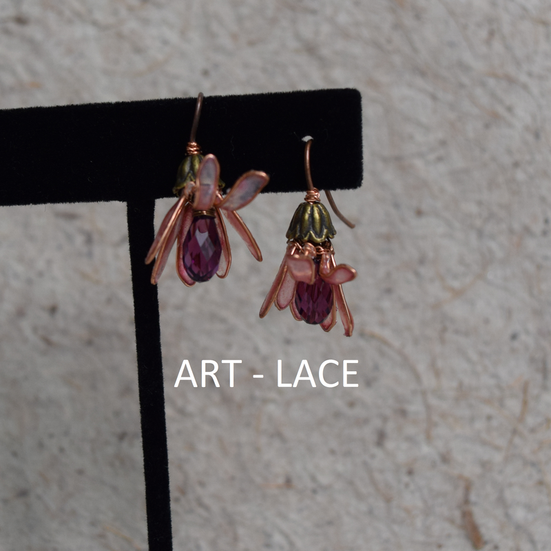 Pink Rose gold earrings women Rustic jewelry Bridal flower stud Swarovski wire resin flower crystal drop copper flower with long stem Unique Stud earrings Flower earrings for women Vintage earrings stylish wedding Pink rose gold earrings stud Swarovski earrings resin wire flowers These Cute little English Flower/blooming flower design stud earrings with long ear piece as flower stem, has antique or vintage looks. Flowers designed to show blooming stage with two petals opened and core of stigmas still unopened which are represented by Purple-red Swarovski teardrop - a very poetic concept. Very light weight for your ears. Flowers are handmade in a single piece of rose gold plated wire, glass paints and resin. Seven petal flower is wrapped around 11mm purple-red Swarovski Teardrop crystal. Earpiece and cap for the flower is antique brass finish which gives it vintage looks. Size : flower diameter 18 mm, Flower Ht. 20 mm, Full drop from the top 28 mm roughly. Please see all the pictures before you purchase. Customization to any colors possible. Not suitable to wear during swimming / bathing.