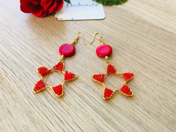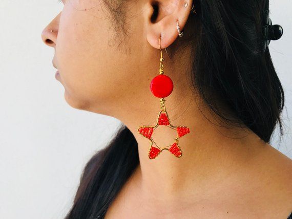 **Order at https://www.etsy.com/au/listing/612767890/rose-red-earrings-red-star-drops-summer ** This Boheme rose red star summer earrings is a mix of ethnic retro and disco crazy style. Paired with red vintage plastic beads, this unique wire wrap earring is designed for those who love to make elegant and eclectic statements. The golden star is wire wrapped with druzy red seed beads and embellished with a red disc bead on the top. Lightweight and easy to carry, this design will surely become your go to this season. **Item is ready to be shipped. Free shipping within Australia ** Length of drop - 3 inches (7.62 cm) Please Note - For hygiene purpose, the ear wires will be replaced with a new one when you order. For information on Returns and exchange, please refer: https://www.etsy.com/shop/deckorate#policies Order together to pay single shipping. Thank you for visiting my shop https://deckorate.etsy.com Love unique. Buy handmade. ❤ Madhuleena