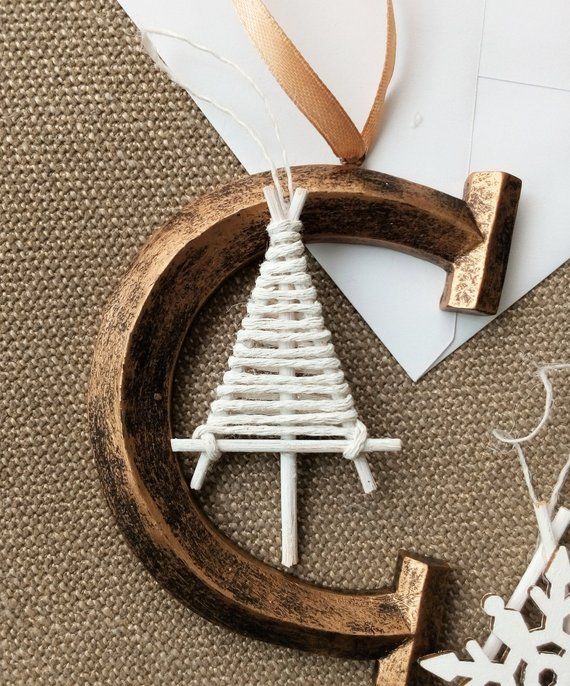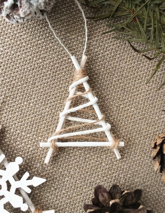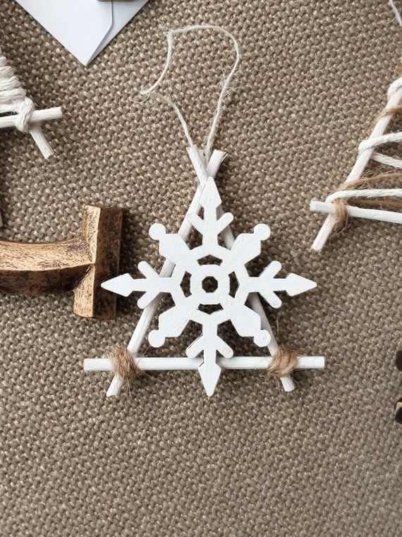 Set of farmhouse style Christmas ornaments. This handmade rustic decorations are made from wooden sticks, decorated with twine, rope and wooden snowflake. Great for Christmas tree, fireplace, wreath, staircase or as a finishing touch to any gift package. Dimensions: First ornament 7 cm x 4.5 cm ( 2.7" x 1.7") Second ornament 6 cm x 6 cm ( 2.3" x 2.3") Third ornament 6 cm x 5 cm ( 2.3" x 1.9") Completely handmade and hand painted and so cute for the upcoming holidays! Unique.