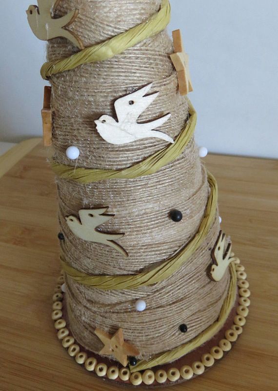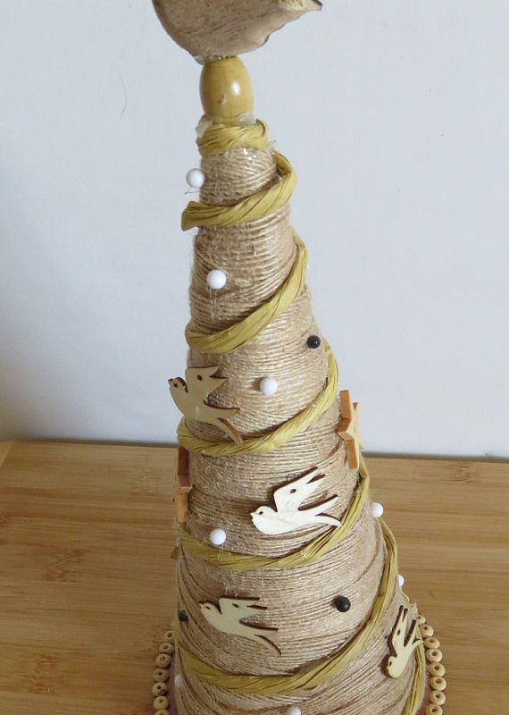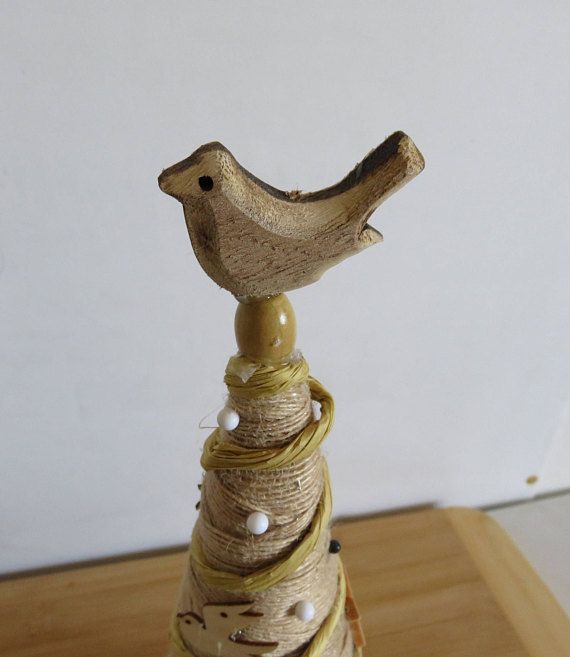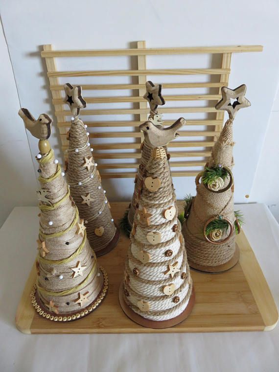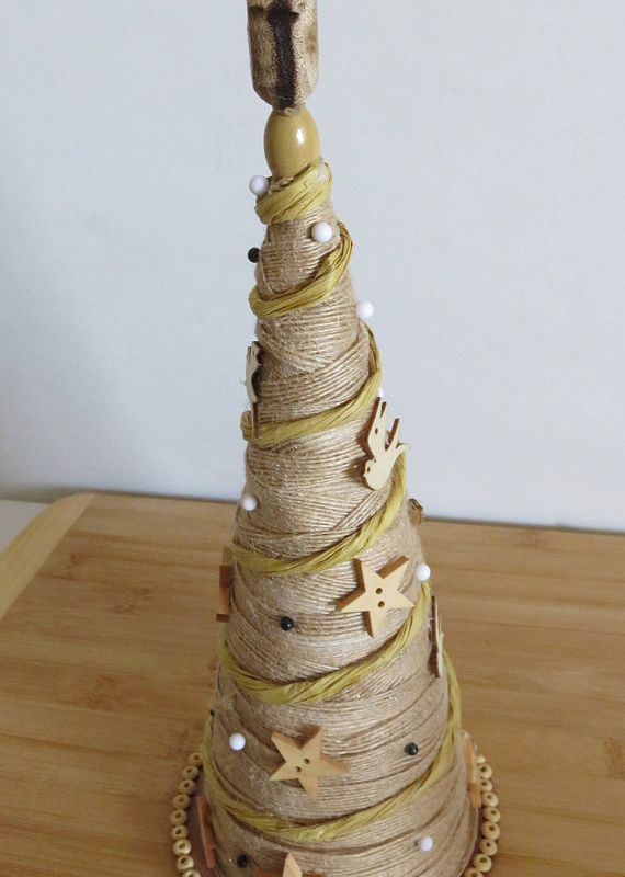This rustic mini Christmas Tree is 10.5" long (26.5 cm) and is perfect for decorating a room or an office for the holidays. Made with a Styrofoam Cone,Jute Rope, Wooden Stars, Wooden Heart, Wooden Flowers, Dark Jute Rope, Jute Twine, Wooden Dove. SIZE: Base diameter is 5" ( 11 cm) A perfect gift for the rustic decor lovers.