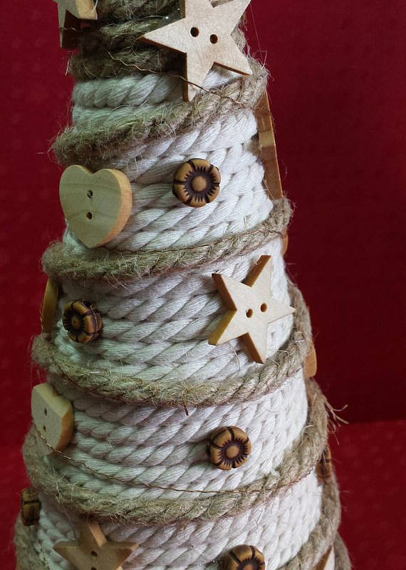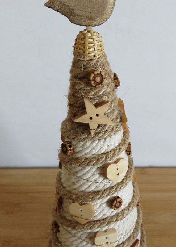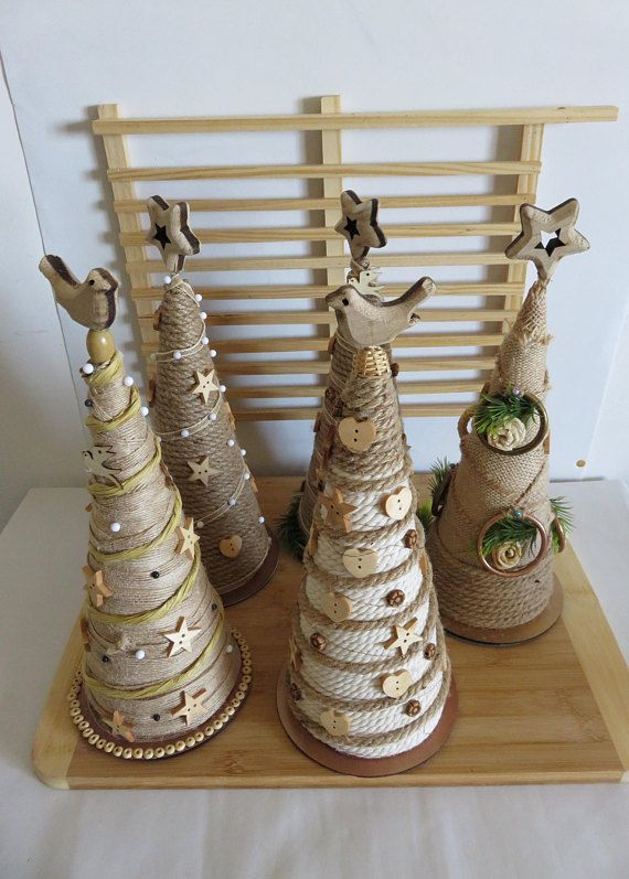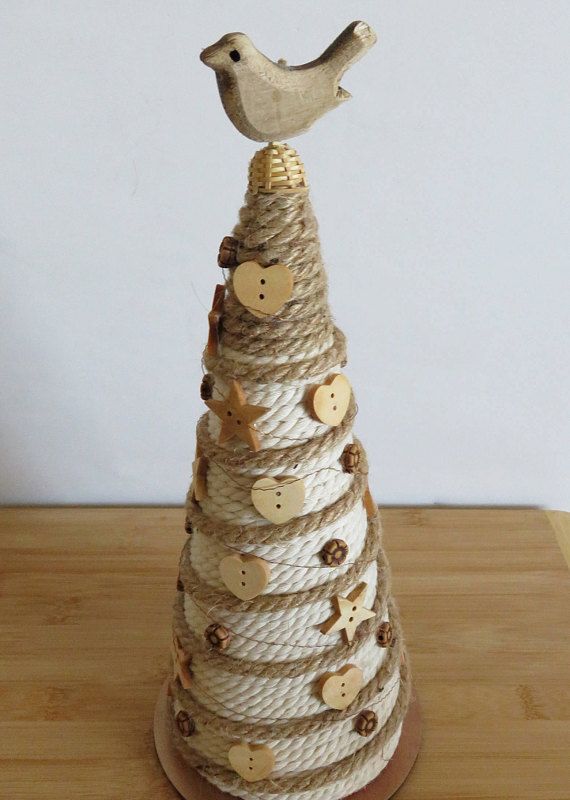 This rustic mini Christmas Tree is 10.5" long (26.5 cm) and is perfect for decorating a room or an office for the holidays. Made with a Styrofoam Cone,Jute Rope, Wooden Stars, Wooden Heart, Wooden Flowers, Dark Jute Rope, Jute Twine, Wooden Dove. SIZE: Base diameter is 5" ( 11 cm) A perfect gift for the rustic decor lovers.