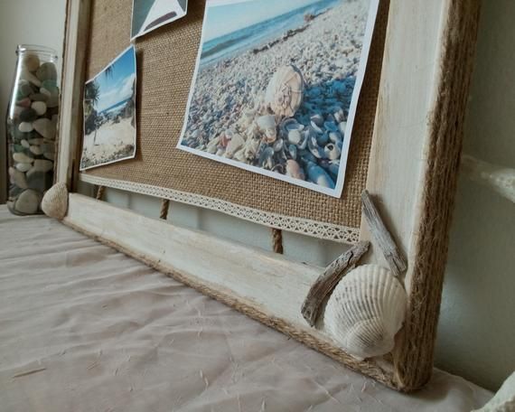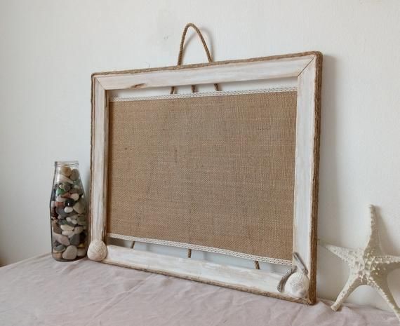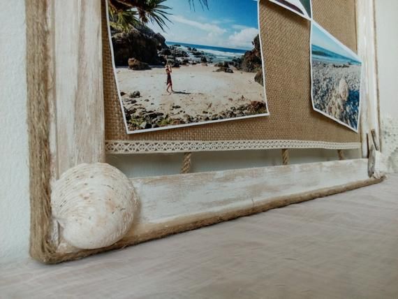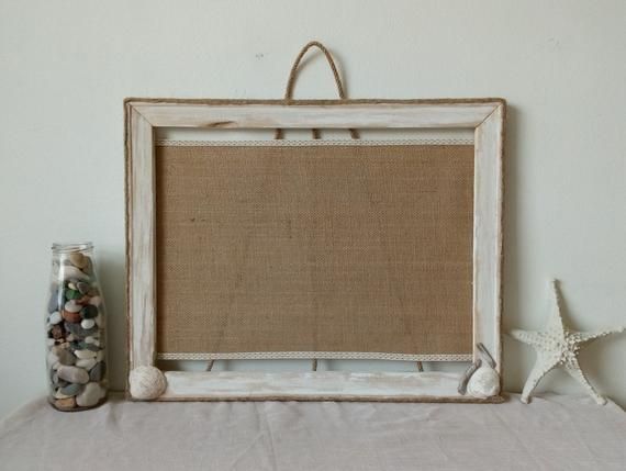 Rustic wood picture frame decorated with rope, seashells, wood chips and colored with white acrylic paint. The back of the picture frame is burlap decorated with lace. Photos can be glued onto the burlap or I can put clothespins for you. This summer wall decor can be great for adding a rustic look to your home, office or cottage, or as a perfect gift for many occasions: Wedding, Birthday, Anniversary, Mother's day, Housewarming... Dimensions 51 cm x 41 cm (20" x 16") Handmade. Unique.