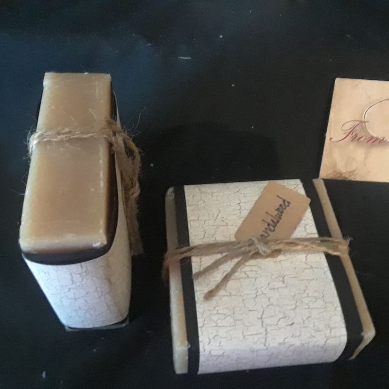 This is a beautiful handmade soap with a great manly scent. The bar is wrapped and ready for gift giving, or a special gift for yourself. These are all natural soaps, with a beautiful scent. Indulge yourself in this wonderful soap. Natural undiluted sandalwood. Nothing but the purest fragrance. Very earthy and woodsy. Ingredients: Olive Oil, Coconut Oil, Soybean Oil, Corn Oil, Hemp Oil, Organic Shea Butter, Water, Lye and Colorant. The bar is 3x3x1 and is 5 ounces in weight.