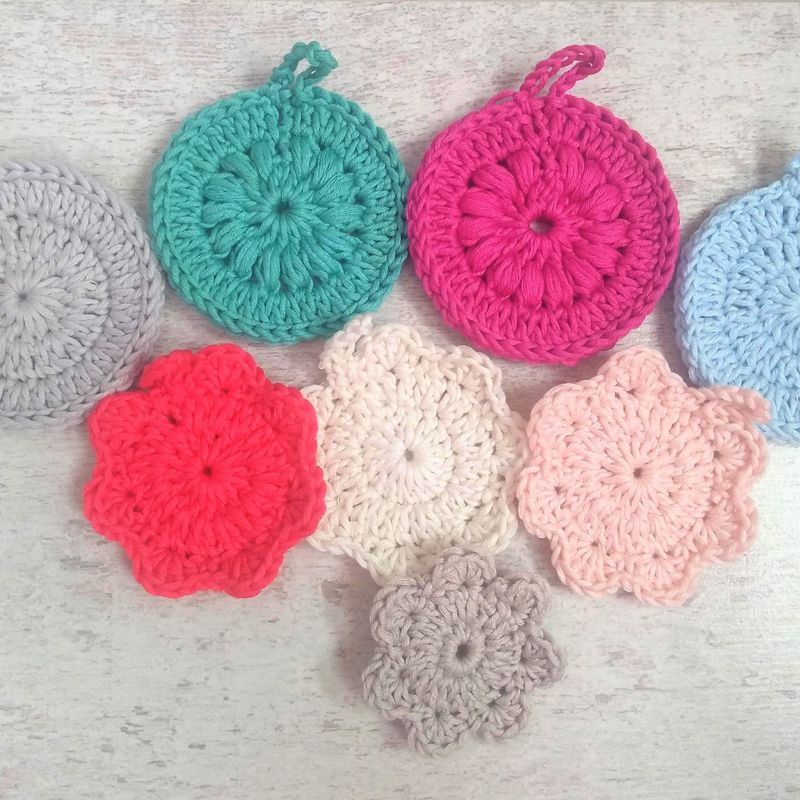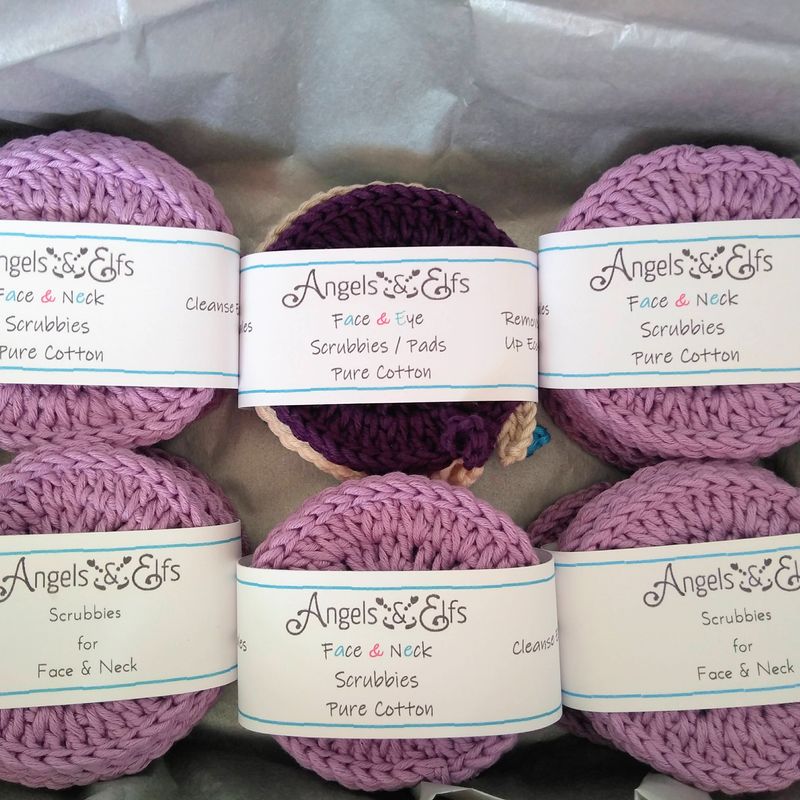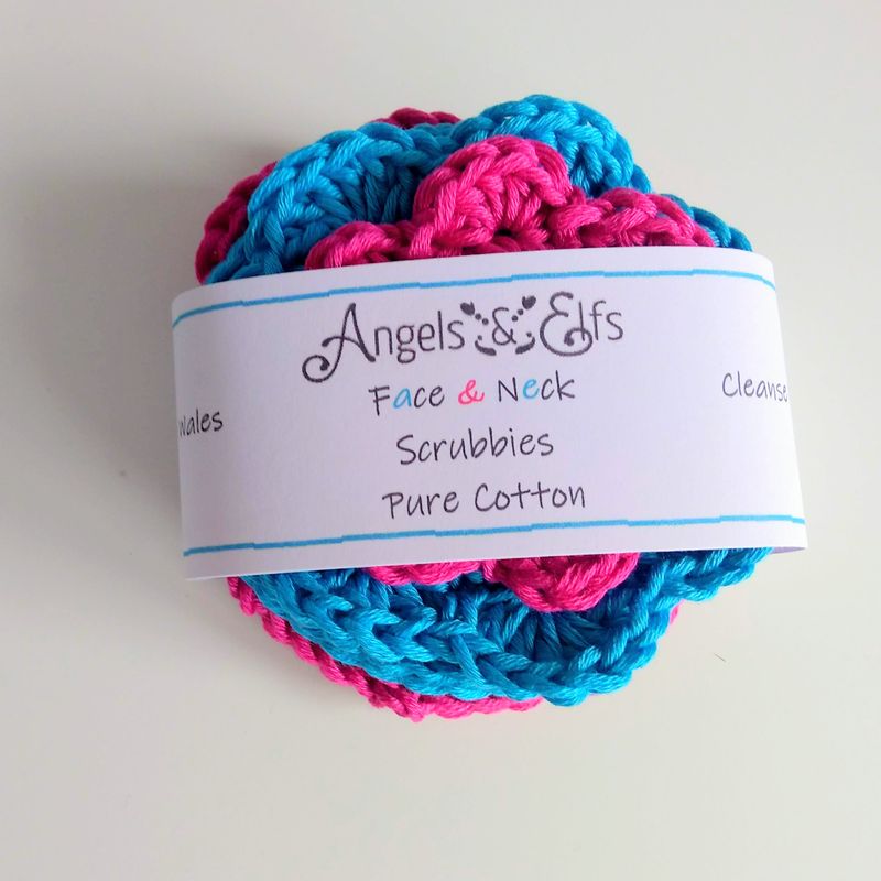 Would you like to use eco-friendly and re-usable pure cotton crochet face & neck scrubbies in your daily skin regime ? These scrubbies tick all the boxes, and in addition, you can choose from a variety of nude and vibrant colours. A set of 7 gives you a scrubbie for each day of the week - use it and then wash it at 40 degrees, maybe with your towels, dry it and re-use it. These scrubbies cleanse, they remove make-up, exfoliate and even massage your face slightly. The cotton I use is Oeko-tex certified and without any "nasties" in the dyes, so you treat your skin to something good while doing good for the environment. A set of seven contains: 1 popcorn pattern scrubbie, with plain or loopy edging 2 plain scrubbies, with plain or loopy edging 3 flower shape scrubbies Let me know if you prefer only plain, or only loopy edgings, and if you like only loops to hang the scrubbies up on, or no loops. Otherwise, the scrubbies come in a mixture of loops and no loops. I have added a photo of different shapes with info on the sizes! I send them in a colour mix - but if you prefer certain colours, or colour mix, please let me know. Available colours: Off white, light beige, beige, peach, hot pink, magenta, turquoise, teal, light green, mint green, lilac, light grey, light blue I love to create something pretty from yarn, and even better if pretty is combined with useful and eco-friendly. Many thanks for having had a look at my post! If you should decide to buy of me, preferred method of payment is PayPal, as it is secure, and you don't even need an account to use it.. Angelika @ Angels & Elfs