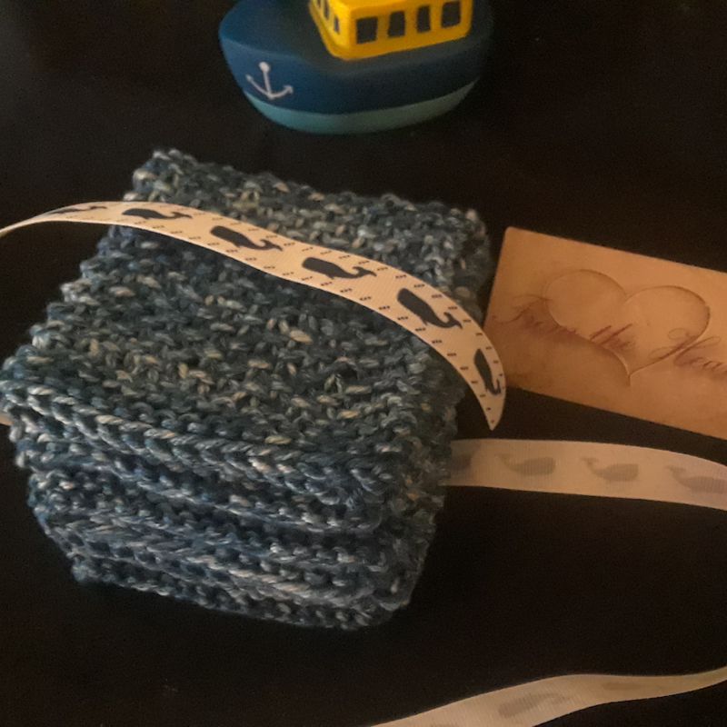 A three pack of cotton, hand knit baby washcloths. They are wrapped in ribbon, perfect for gift giving and each set includes a rubber duck or other bath toy. This is a wonderful present, or purchase for your own baby. 100% cotton, machine wash and dry. *Ribbon may vary from photo.
