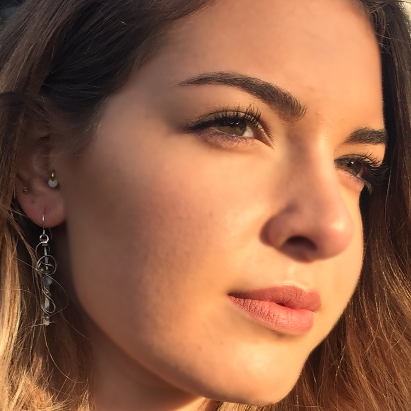 One of a kind unique designer earrings made with exquisite 4mm moonstone gemstones. These Sterling silver earrings are hand crafted by Elaine. The Base is made with Sterling silver and the wire winding into it is made with fine Silver wire balled up at the ends Color: ★ Silver ★ Milky white with blue glow Mateirals: ★ 925 Sterling Silver ★ 999 Fine Silver ★ Moonstone gemstones Size: ★ Gemstone: 4mm, ★ Length: 5cm, ★ Width: 1 cm ☆All Photos, Designs & Text Copyright © 2010-2018 Elaine Jewelry Design (Lapis Horizon)