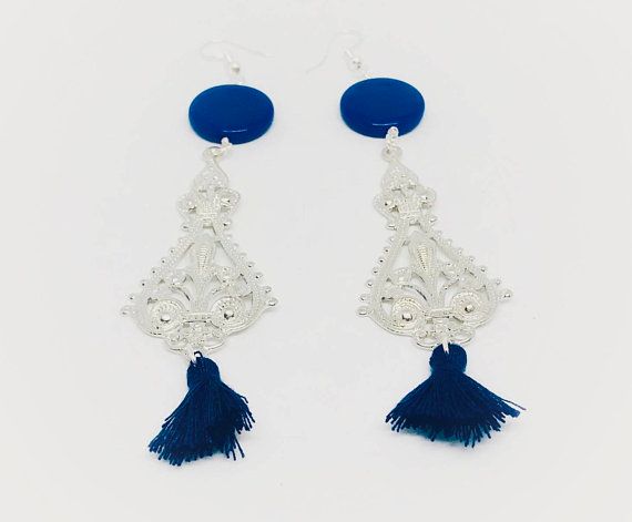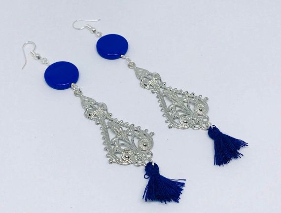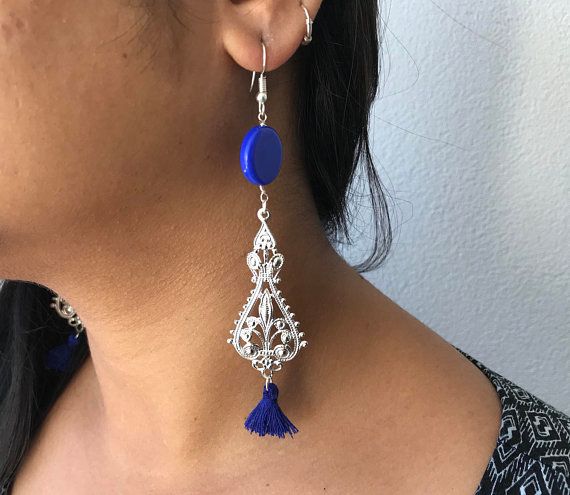 **Order at - https://www.etsy.com/au/listing/591620389/blue-silver-earrings-chandelier-tassel ** The beauty of this handmade long silver and blue chandelier earring lies in the overall interplay of its intriguing elements, rhythm, and pattern. Made of authentic elements, they are versatile and looks equally great with any boho, retro, traditional, or ethnic outfits. They are lightweight and easy to carry, comes with a drop length of 3.5 inches from the top of the earring hook. Item is ready to be shipped. Free Shipping within Australia. Length of earrings - 4 inches (10.16 cm) Length of drops - 3.5 inches (8.89 cm) Please Note - For hygiene purpose, the ear wires will be replaced with a new one when you order. For information on Returns and exchange, please refer: https://www.etsy.com/shop/deckorate#policies Order together to pay single shipping. Thank you for visiting my shop https://deckorate.etsy.com Love unique. Buy handmade. ❤ Madhuleena