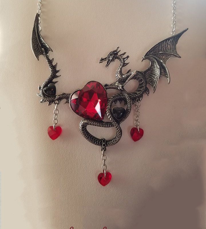 Dragons had been feared and loved for centuries. Such majestic wonderful creatures. Guardians, & fire fae. Appreciate your love for dragons. This necklace is large, it is not small. Necklace is approximately chain is longer on this necklace than my other listings. Available in two colors. One of each color available. The gems are acrylic. Style One: Blue Style Two : Red Makes a lovely item for yourself or as a present for another. Hypo allergenic. Made for those with metal allergies. Safe for giving when you don't really know if they have a metal allergy. I make custom orders. If you want to order in bulk please contact me, so I can arrange the order.