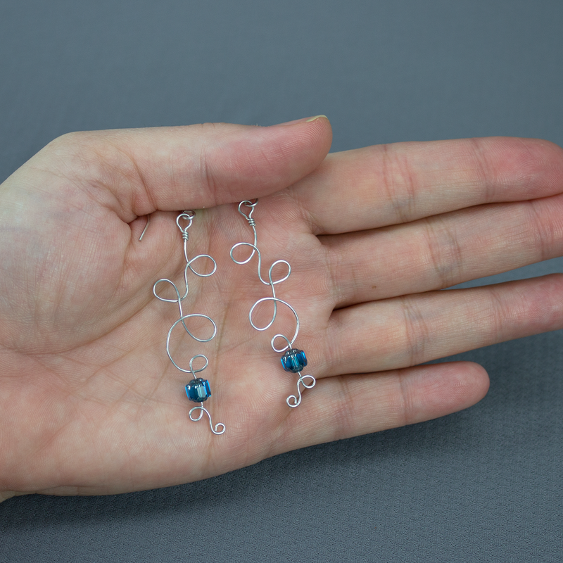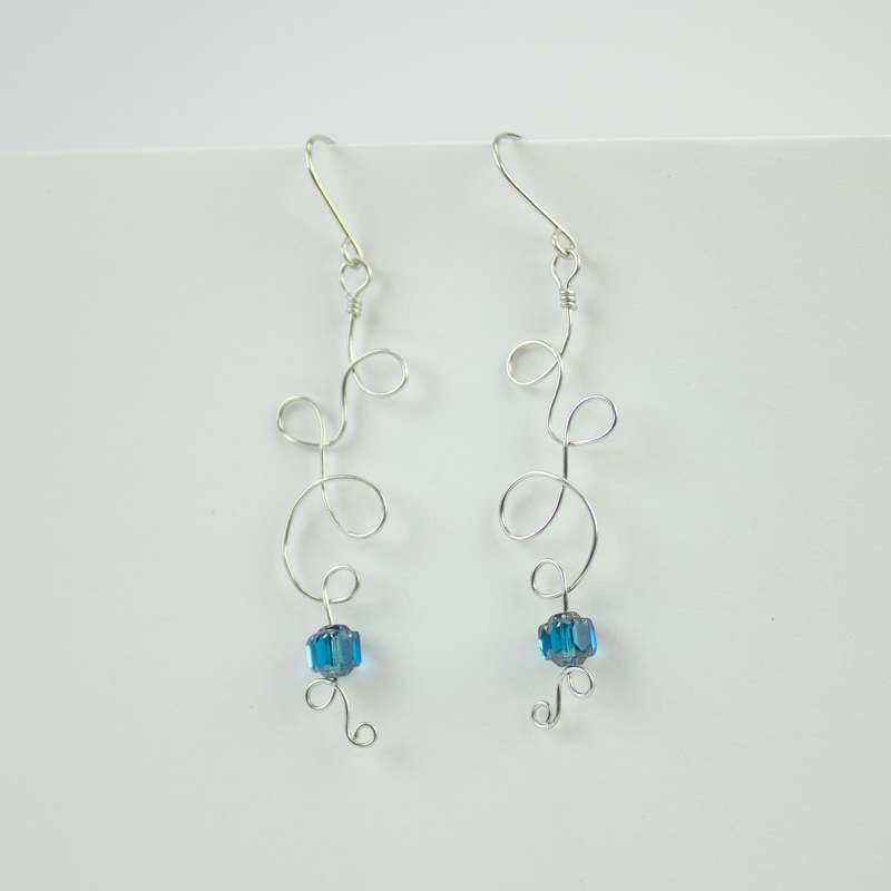 Silver plated wire and bead earrings, wirework, curly cues