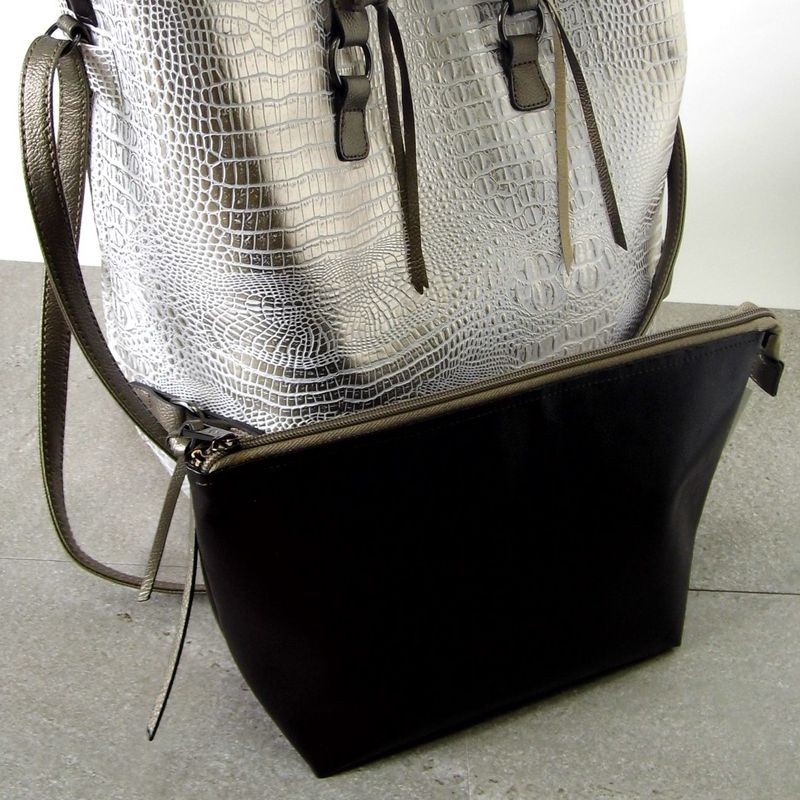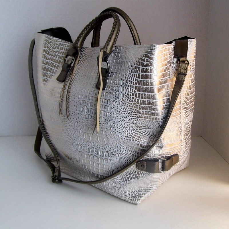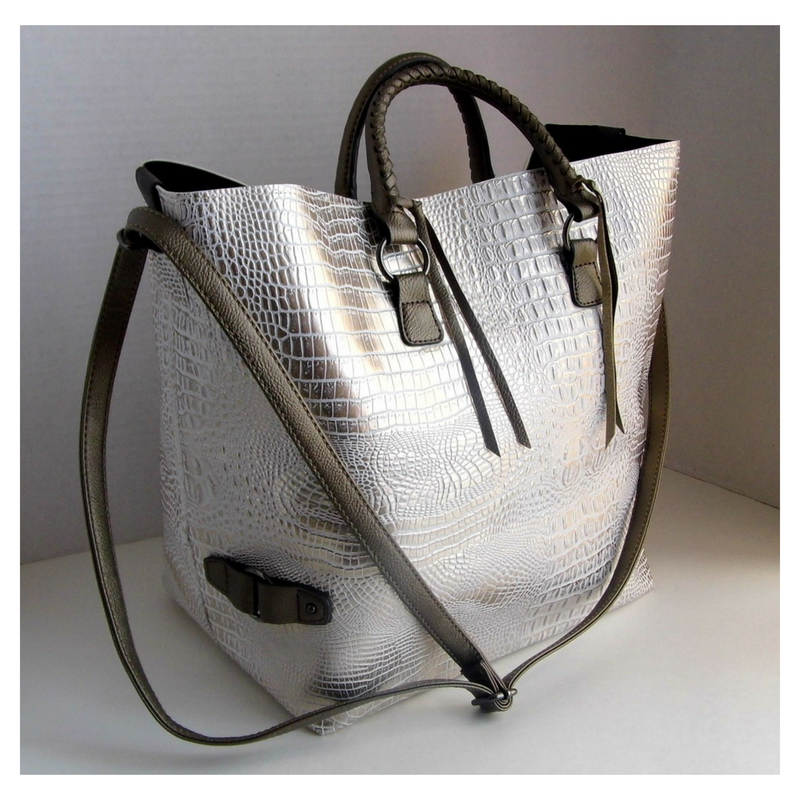 SOLD - Silver tote bag, Vegan tote bag, Faux crocodile bag, Weekend tote, Cream tote bag, Womens weekender bag, Bag with pouch, Overnight bag