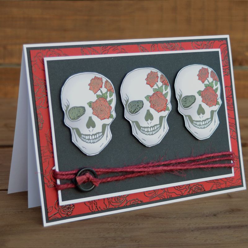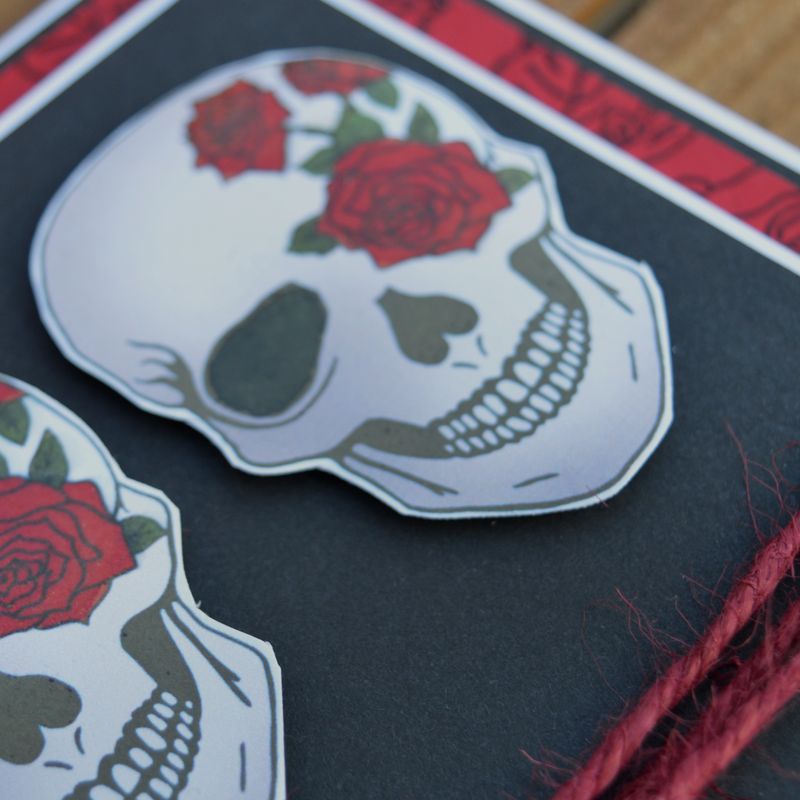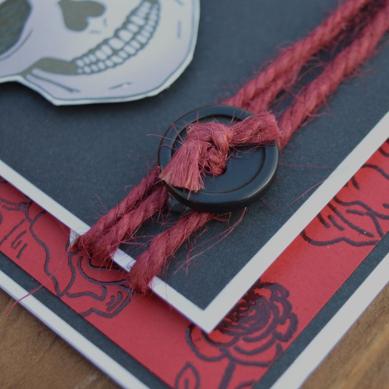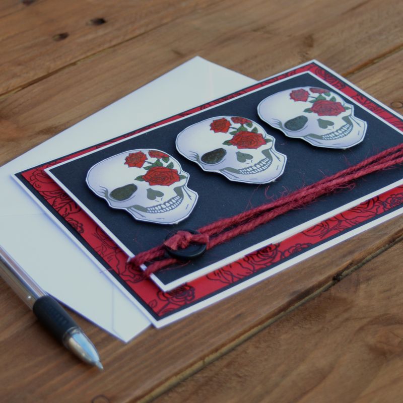 This skull card is handmade using high quality card stock and has been decorated with 3D skulls, hand printed card, a decorative button and twine. This alternative card is blank inside so can be used for any occasion, ideal for writing your own message inside. It also comes with an envelope and is packed in a clear cello bag. This handmade greetings card measures 5 inches by 7 inches. SHIPPING FROM THE UK - Shipping Prices Vary - www.redvesseldesigns.com