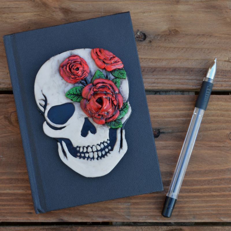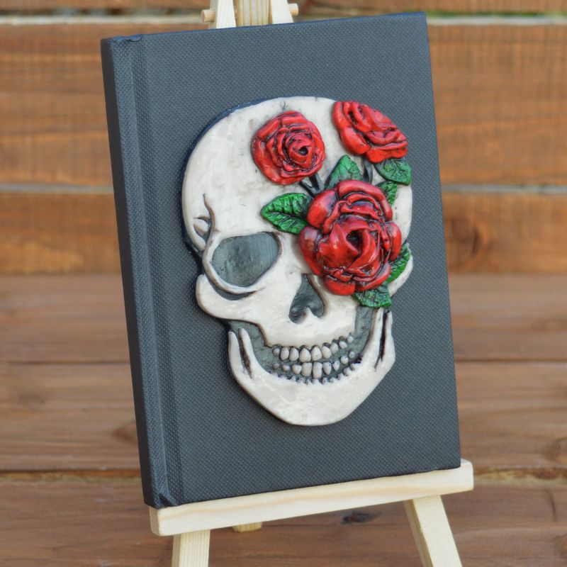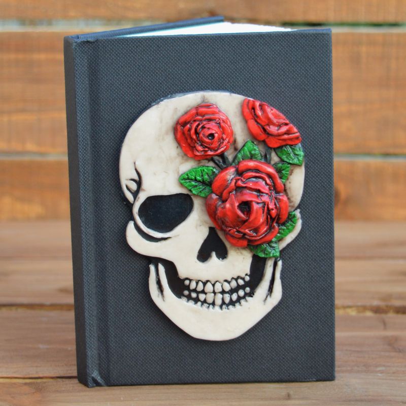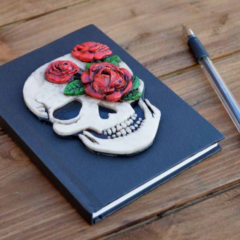This skull and rose notebook has been sculpted by hand and features a large skull and rose design. This black notebook measures 6 inch x 4 inch and is flat backed so is easy to write in. This book also has lined pages. This design has been created using a hand drawn illustration originally drawn by us so is totally unique. SHIPPING FROM THE UK - Shipping Prices Vary - www.redvesseldesigns.com
