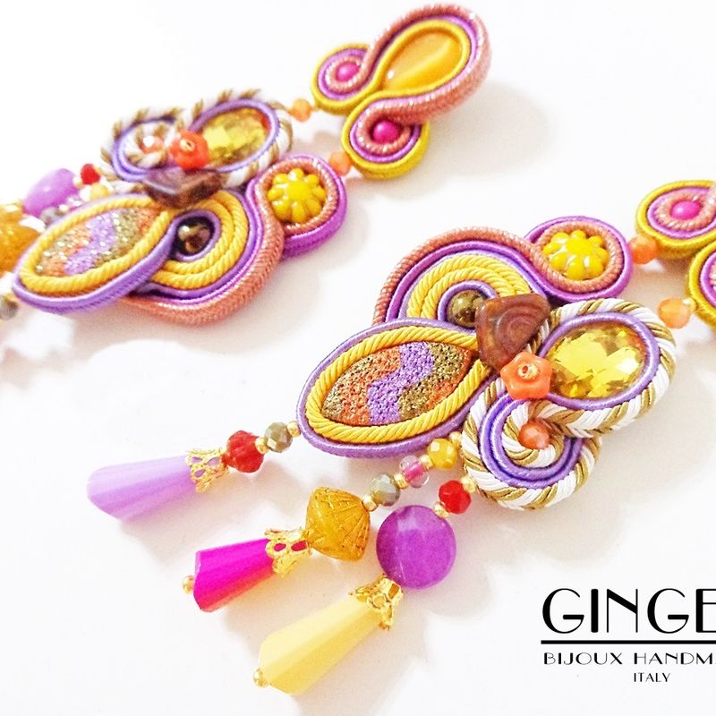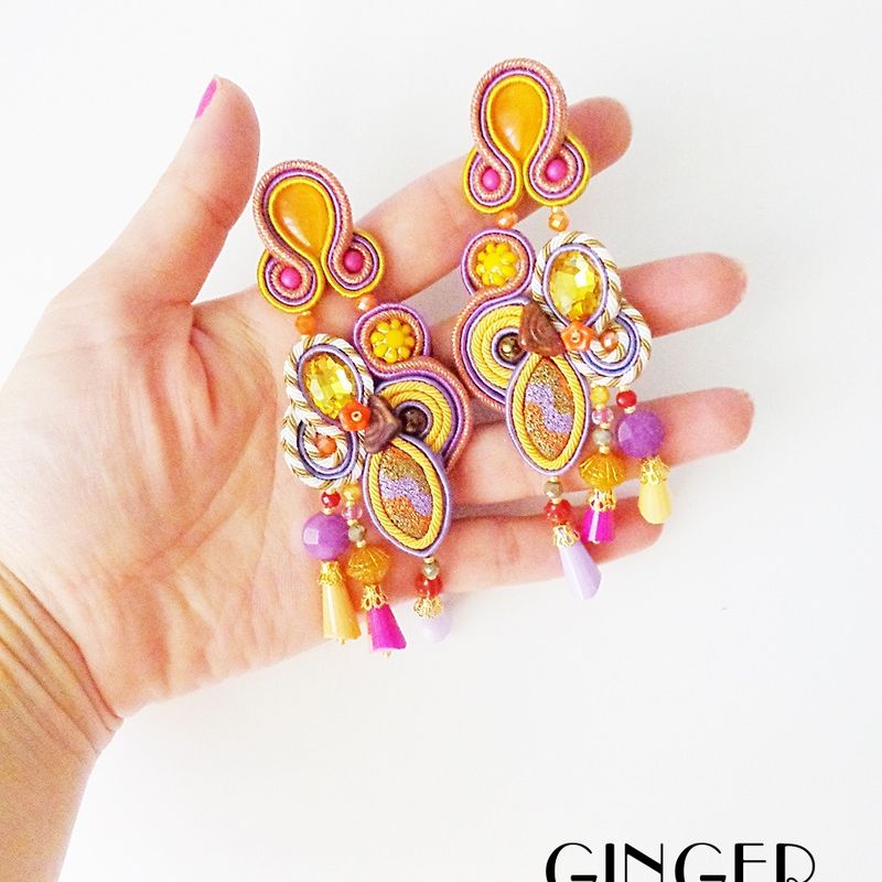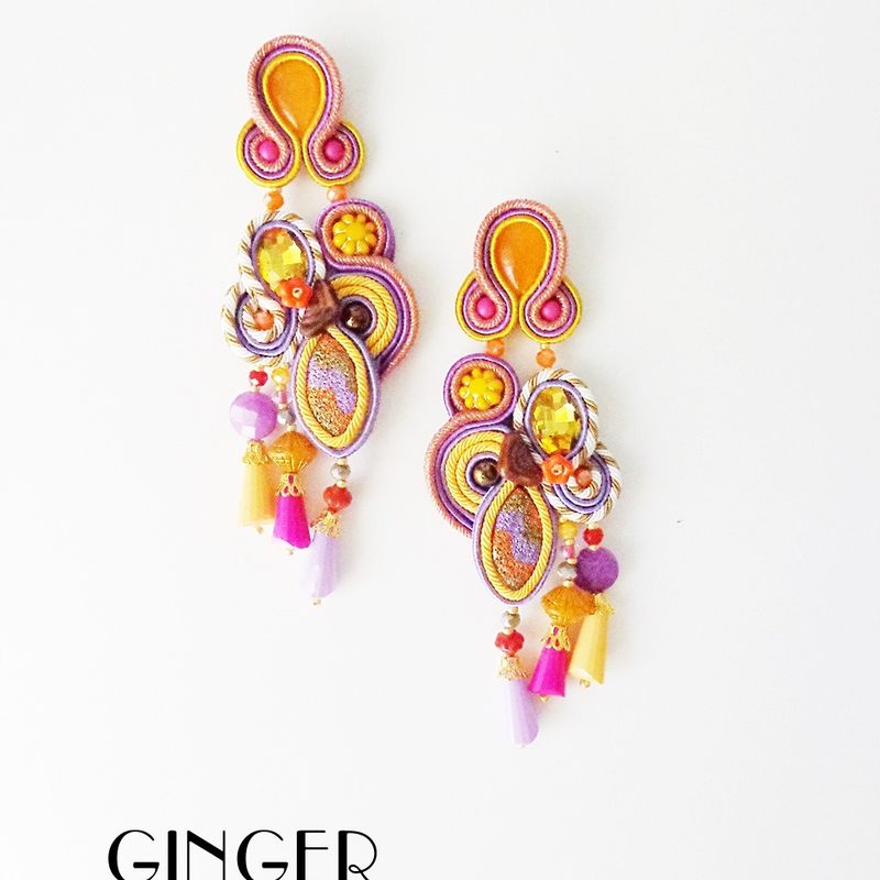 Soutache earrings, yellow earrings, purple earrings, gypsy costume jewelry, belly dancer jewelry, kawaii earrings, autumn pumpkin earrings