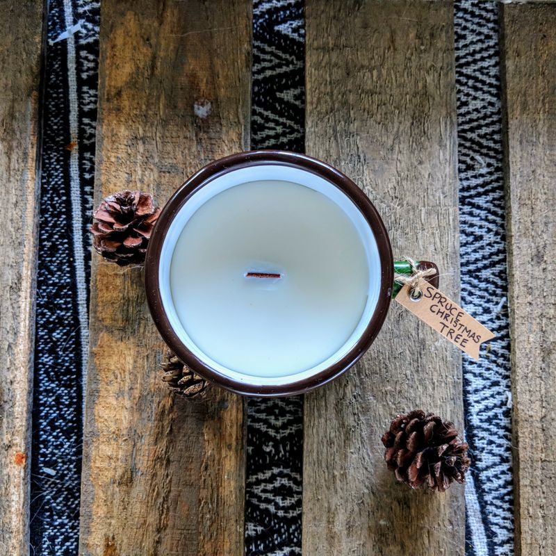 ↟↟A freshly cut spruce tree with a subtle note of sweet holiday citrus. ↟↟ •8oz. of 100% Soy wax Hand-poured into reusable camping mugs• •Approx. 30 hour burn time• •Just be sure to remove any excess wax and clean out your mug once your candle is tapped out and enjoy your morning brew or whatever adventures come your way! Endless possibilities. ;) ••BURNING TIPS: First time burn Approx. 3 hours to ensure the melt pool has reached ALL the way to the outer edges so that you get the most out of your candle. In other words, allow soy candles to burn ALL THE WAY across to the edge of the container the first time you burn it before putting it out. This ensures that your soy candle does not “tunnel” as it burns, which leaves wax along the sides of the container. :) Never burn candles for more than 4 hours at a time to get the most out of your candle!