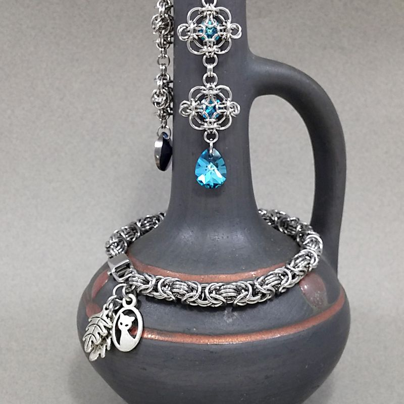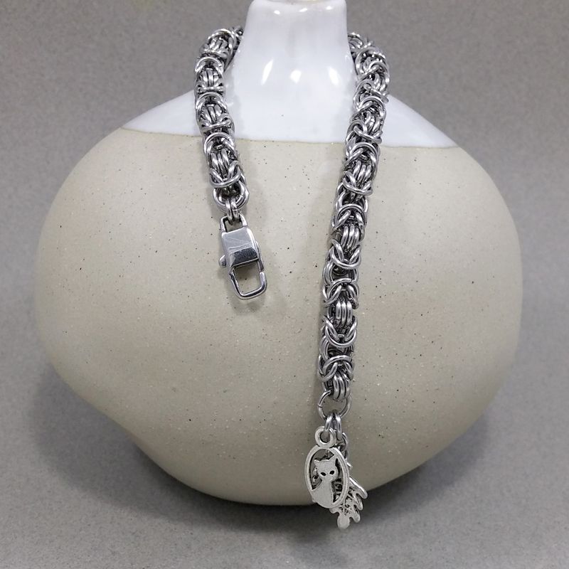 For this Beautiful bracelet I used very hard Stainless Steel Chain Mail jump rings 6mm in Chain Maille Bizantine weave. The bracelet charming with leaves & pretty kitty :) I always can to change the charms for you. Bracelet measures is 8" with Stainless Steel lobster clasp. Very feminine, very strong, will not tarnish and would look beautiful on women of all ages <3 I do combine shipping with any FB auctions or my Etsy store. Feel free if you have a question! Thank you for stopping by! FestiJe - Artisan made Jewelry #FestiJe