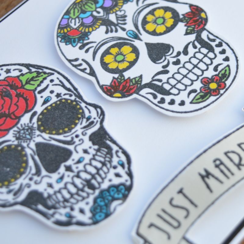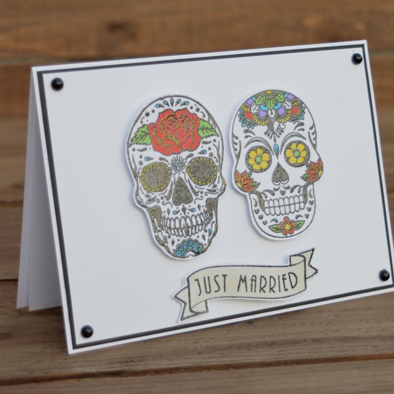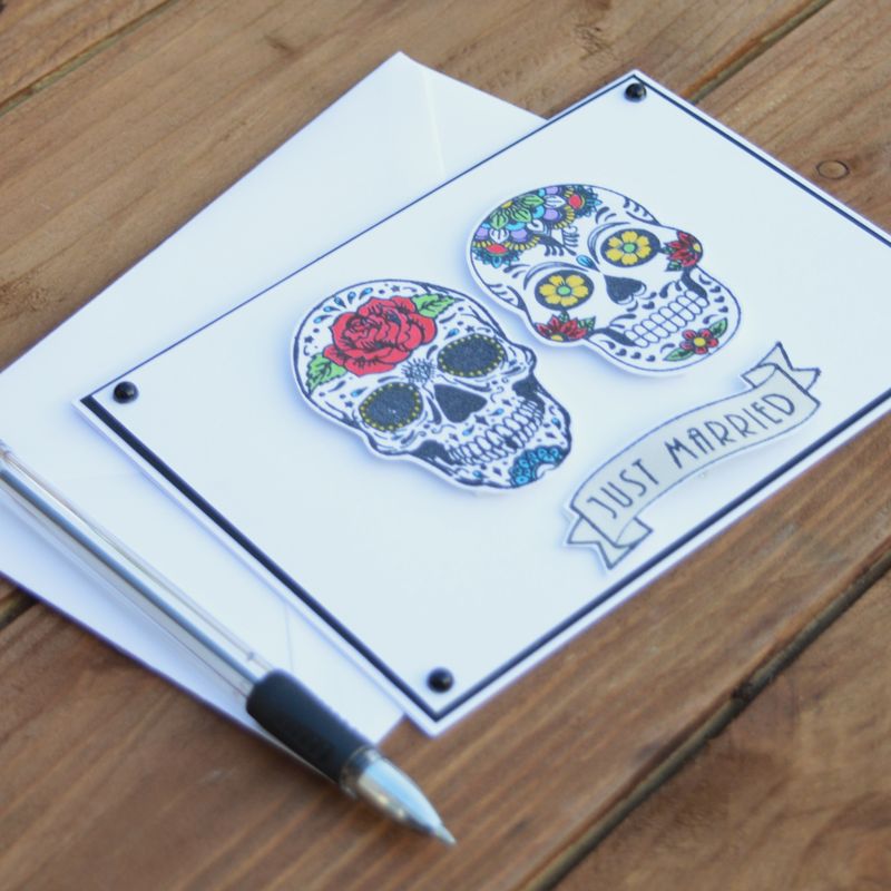 This sugar skull wedding card has been handmade using high quality card stock. This skull card has been decorated with two hand stamped skulls and a banner that reads "Just Married." This greetings card is ideal for any couple! This alternative wedding card is blank inside so is ideal for writing your own message. It also comes with an envelope and is packed in a clear cello bag. This skull wedding card measures 4 inches by 6 inches. SHIPPING FROM THE UK - Shipping Prices Vary - www.redvesseldesigns.com