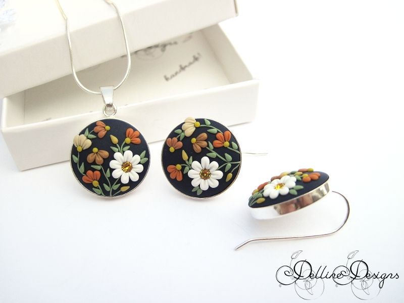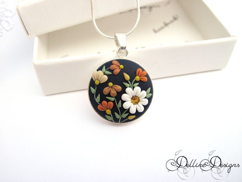 A perfect gift for you, or for someone dear: an elegant, handmade, unique piece of art! The flower embroidered cabochons are made entirely by hand, with no molds. Tiny pieces of clay in brilliant colors were applied carefully, to bring life to this lovely piece of jewelry. https://www.etsy.com/shop/DellineDesigns