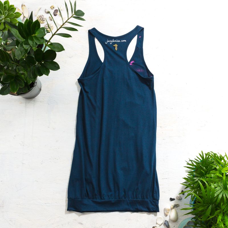 TARI, petrol blue short sleeveless dress with Five-colour Hand Painted Front is made of breathable 100% cotton fabric. TARI features playful, yet cool dancy style with pockets, racer back and beautiful U-neck line followed by decorative buttons. TARI is a perfect summer outfit. You can easily style it with RIA shorts or leggings and flip-flops for a casual stroll on the beach. TARI dress is super comfortable to wear! _ What makes TARI unique is a Hand Painted Design that frees your imagination to fly high and dive deep into the rain forest infinity. All Junglenice items are hand painted and each one of a kind visual journals from the tropics. TARI would translate into words somehow like this: You are My Music I am Your Dance. We are Love Caressing the Sand At Sunset. _ Colours: Petrol Blue with Black, Pink, Yellow and Purple Hand Painted Front and Hornbill Pendant _ Materials: 100% Cotton, Water Based Textile Paint, Metal Pendant _ Size: One Size Fits All _ Size Guide *Please, Study the Last Product Picture*: 1: 67.5 cm = 26.57 in 2: 84.5 cm = 33.26 in 3: 86.5 cm = 34.05 in 4: 41 cm = 16.14 in 5: 22 cm = 8.66 in 6: 24 cm = 9.45 in 7: 90 cm = 35.43 in 8: 43 cm = 16.93 in 9: 49 cm = 19.29 in *Measured Flat, 1cm = 0.393701 in, 1in = 2.54 cm, Measurements are Approximate* _ Care: Cold Wash, Max. 30 °C = Max. 80 F, Hang Dry = Do not Tumble Dry, Do not Iron Directly on a Painted Design _ Message Me with Any Question: handpainted@junglenice.com www.instagram.com/junglenice/ www.facebook.com/veryjunglenice/ _ Should You Wish to Order a Custom Hand Painted Junglenice Design? Contact Me: handpainted@junglenice.com