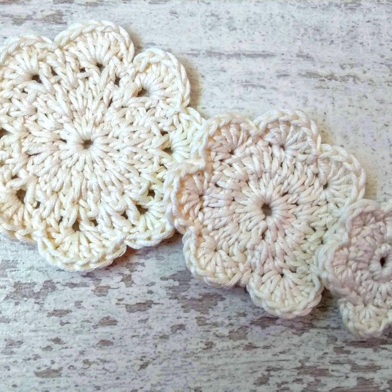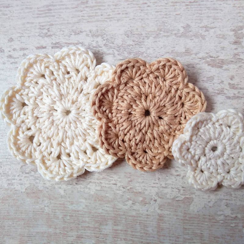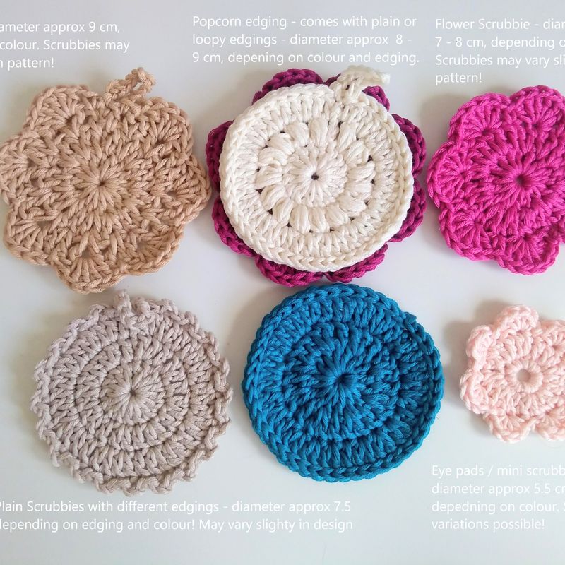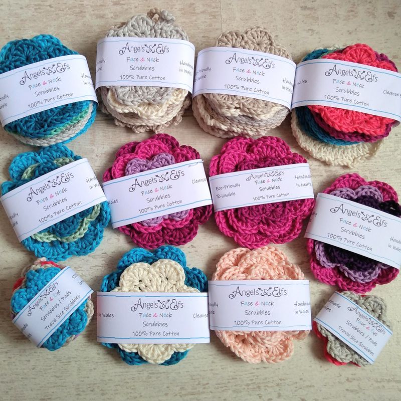 You will receive a set of 3 beautiful flower shaped pure cotton face & neck scrubbies in 3 sizes - big, medium and small. Try them out for yourself and feel the difference pure oeko-tex certified cotton with no nasties in the dyes will make to your skin, and think of the benefits for our beautiful planet Earth - deeply in need of our help in reducing waste. The big flower is about 9 cm in diameter - medium size is about 7 cm in diameter - and the small scrubbie or eye pad, perfect for removing eye make up if you prefer a separate pad, is about 5.5 cm Approximate measurements because each colour is slightly different in texture and so, in size If you like to order a set, please let me know if you prefer nude colours, which are in this case, off white, light beige, beige, and light grey, or let me know if you like a random set of colours, or, off white, light beige, beige, light grey, peach, turquoise, teal, hot pink, raspberry, mint, light green, lilac, or purple Royal Mail shipping charges go on top - please choose: 1st class, 2nd class, or signed for Preferred Payment: PayPal as it is secure Many thanks for having had a look ! Angelika @ Angels & Elfs