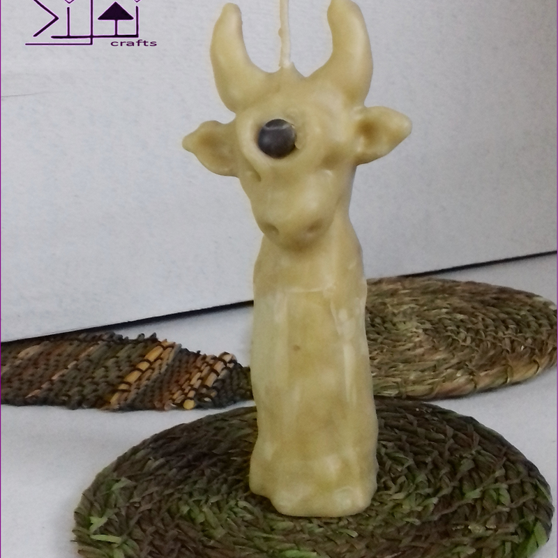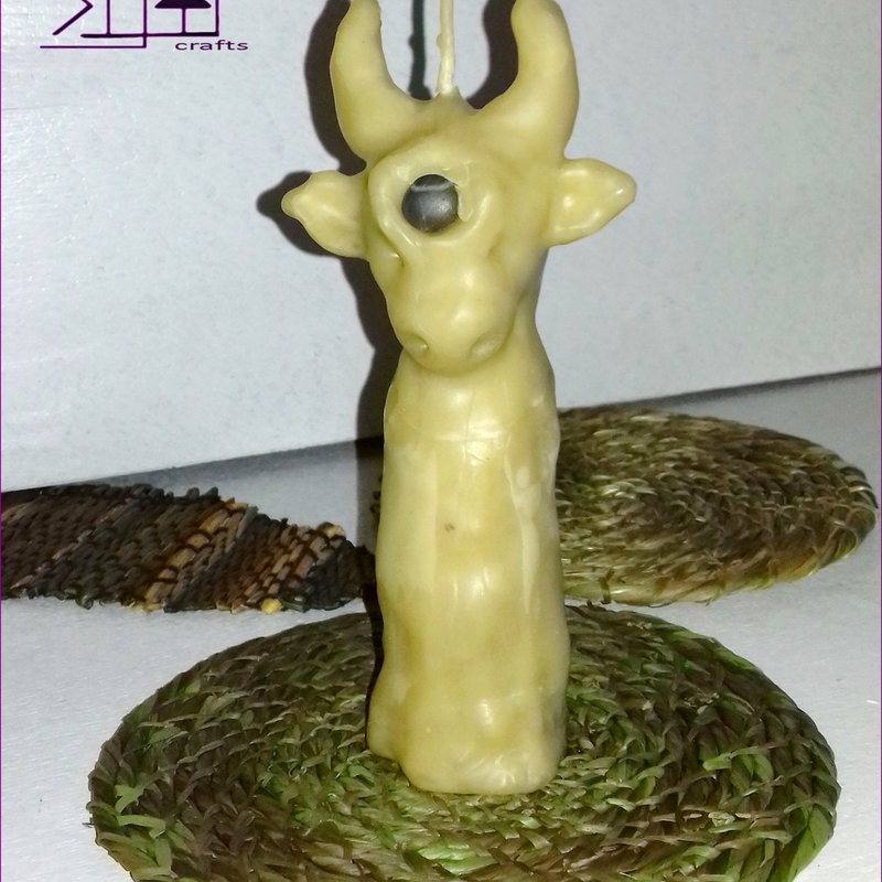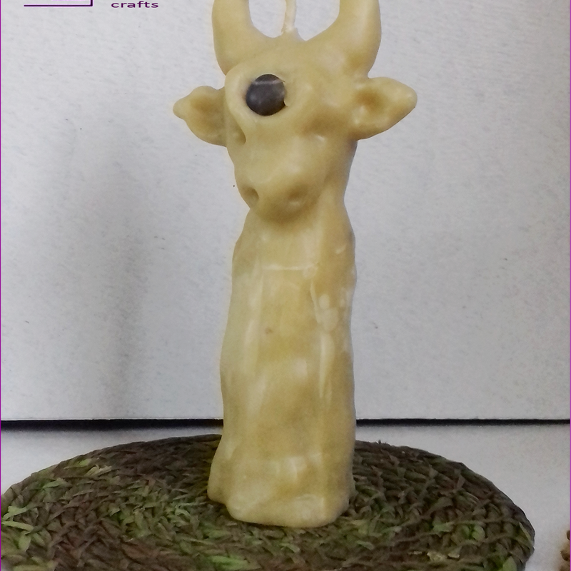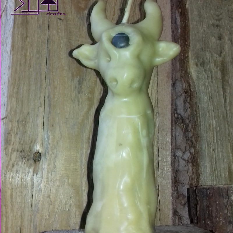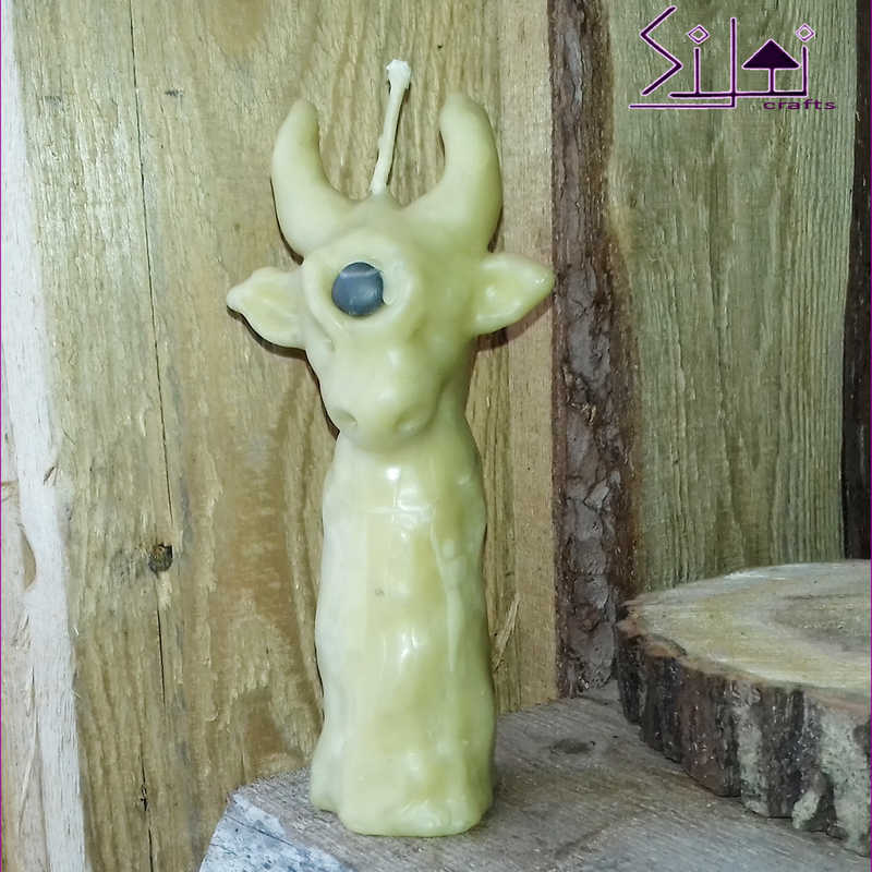 Hand-sculpted, decorative and fully functioning natural beeswax candle with a wishing stone on the forehead of this horned animal - one of a kind item with witchy, rustic feel you won't find anywhere in the world. In Vedic culture a cow is considered the symbol of prosperity and fertility as it symbolizes Earth and Sky. While the bull is embodiment of male polarity, the cow holds feminine energy - gentle, calm, grounding, nourishing and fertile. This natural beeswax ghost candle was made sculpting hot beeswax melted on live fire. No plastic moulds or silicone containers were used to pour in the hot wax to form a candle. It's a truly handmade one of a kind creation. Making a similar candle is possible, but it will never get repeated exactly the same. It is made of pure, natural beeswax that will fill your home with the delicious aroma of honey and blooming meadows while the candle is burning. Dimensions: Height: 16cm/6.29", Base diameter: 4.5cm/1.7", Weight: 150g/5.29oz