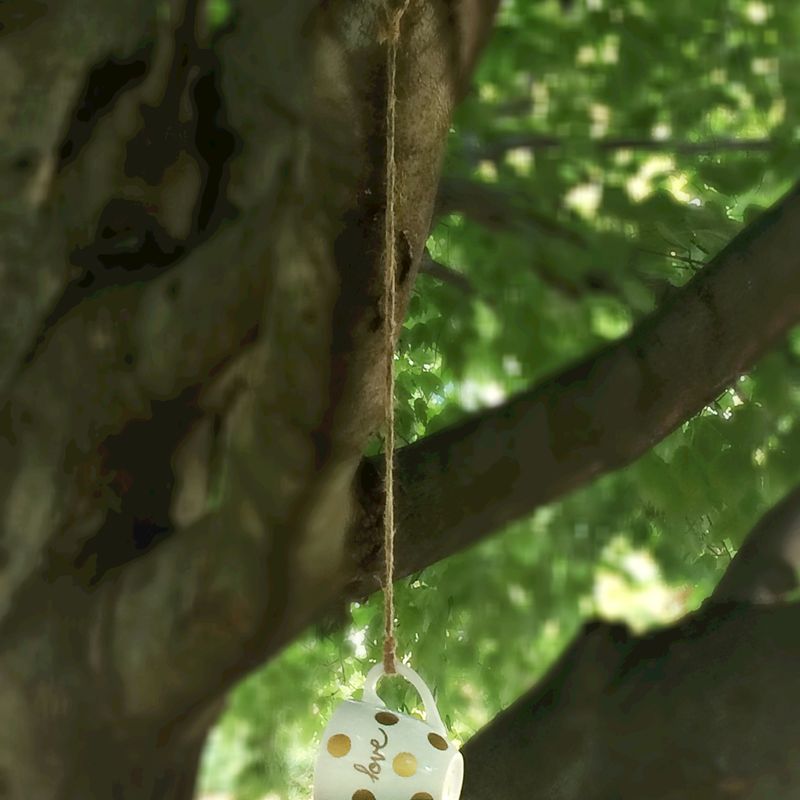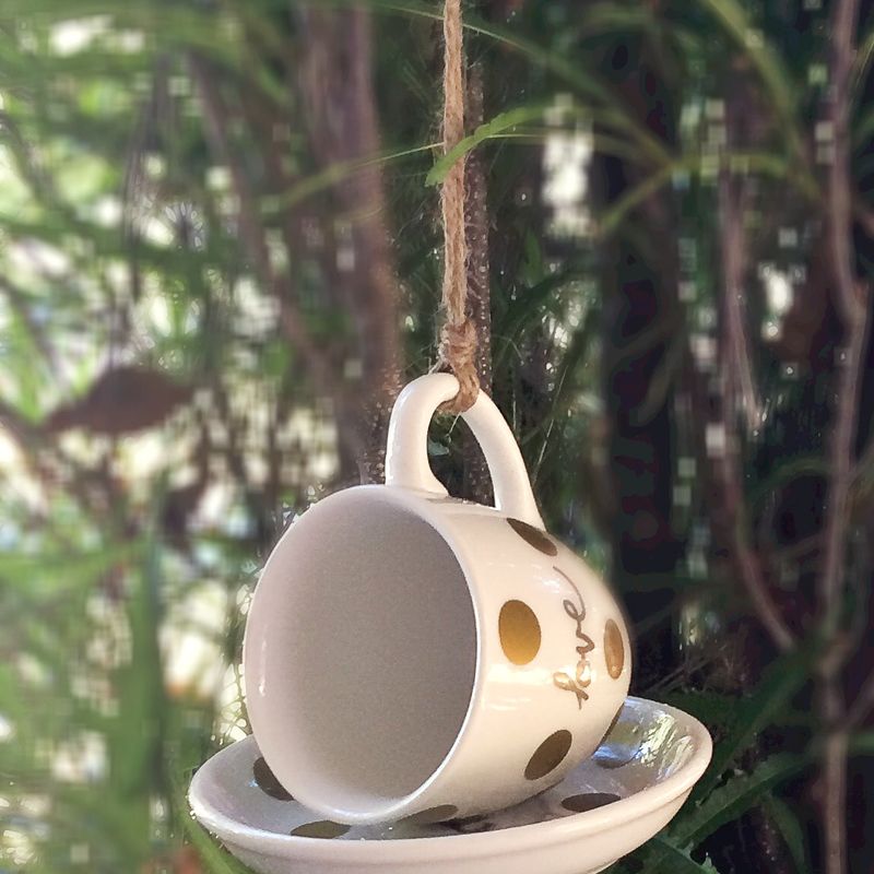 ITEM- one ceramic hanging Tea Cup Bird Feeder with string for hanging ITEM DESCRIPTION - small cream colored ceramic tea cup and saucer with gold polka dots & word LOVE on the front side of cup. Securely attached and strung up with strong burlap string double knitted at handle and looped at top for easy hanging SIZE - 3.75 inches from base of saucer to handle COLOR- cream, gold ACCENTS- n/a MATERIAL- ceramic, e6000, burlap string USES- fill with some bird seed, hang & enjoy! PROCESSING & SHIPPING- see shop description RETURNS- see shop description