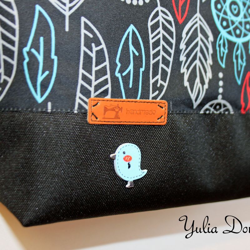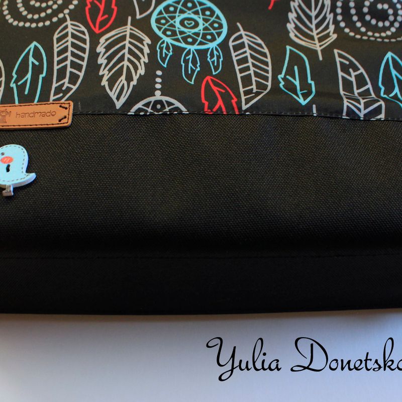 Practical, handy, roomy bag suitable for any weather conditions. Fits A4 format goods. Great for shopping, travelling, studies. Made of cloaking (with owls printed on it), quilted lining and elastic polyethylene foam. Fastens with a zipper. Reinforced bottom. Handles slings, fits for wearing on a shoulder or a hand. Two pockets inside (one with a zipper). 37cm height, 35cm width, 7,5cm bottom, 61cm handles' length