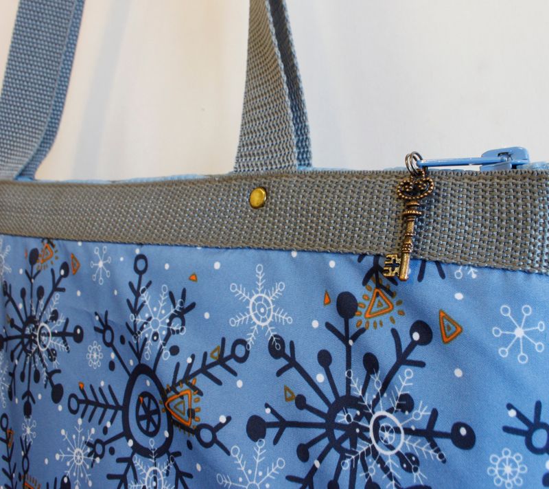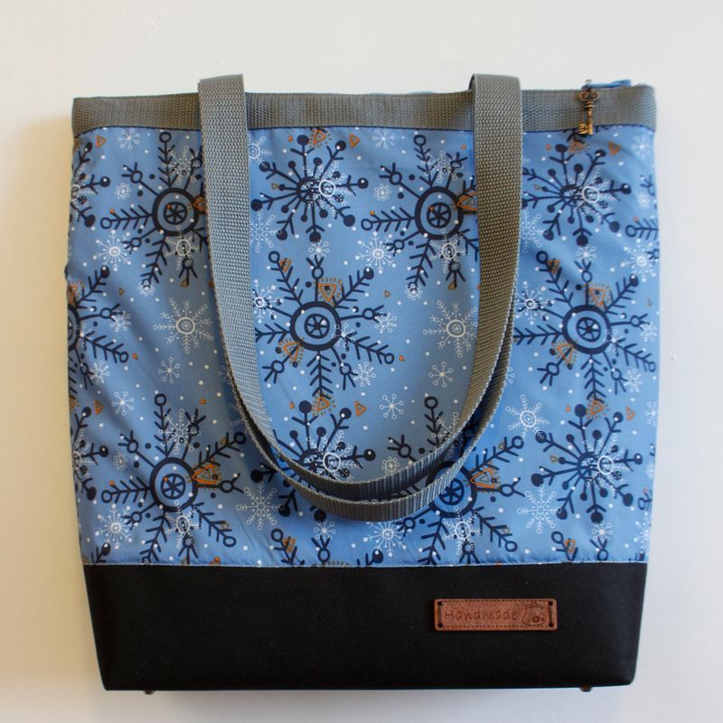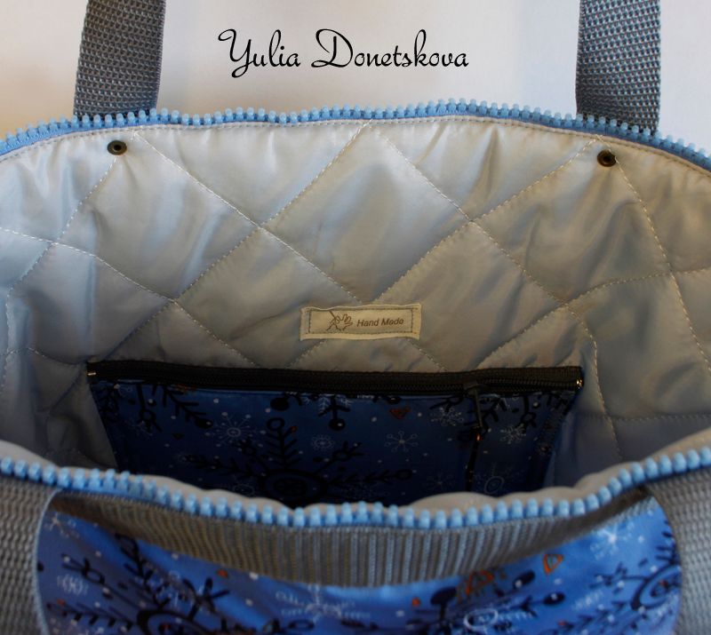 Practical, handy, roomy bag suitable for any weather conditions. Fits A4 format goods. Great for shopping, travelling, studies. Made of cloaking (with owls printed on it), quilted lining and elastic polyethylene foam. Fastens with a zipper. Reinforced bottom. Handles slings, fits for wearing on a shoulder or a hand. Two pockets inside (one with a zipper). 34cm height, 35cm width, 7,5cm bottom, 61cm handles' length