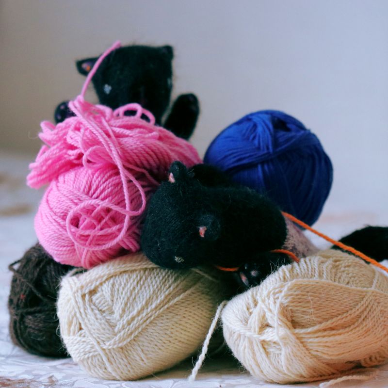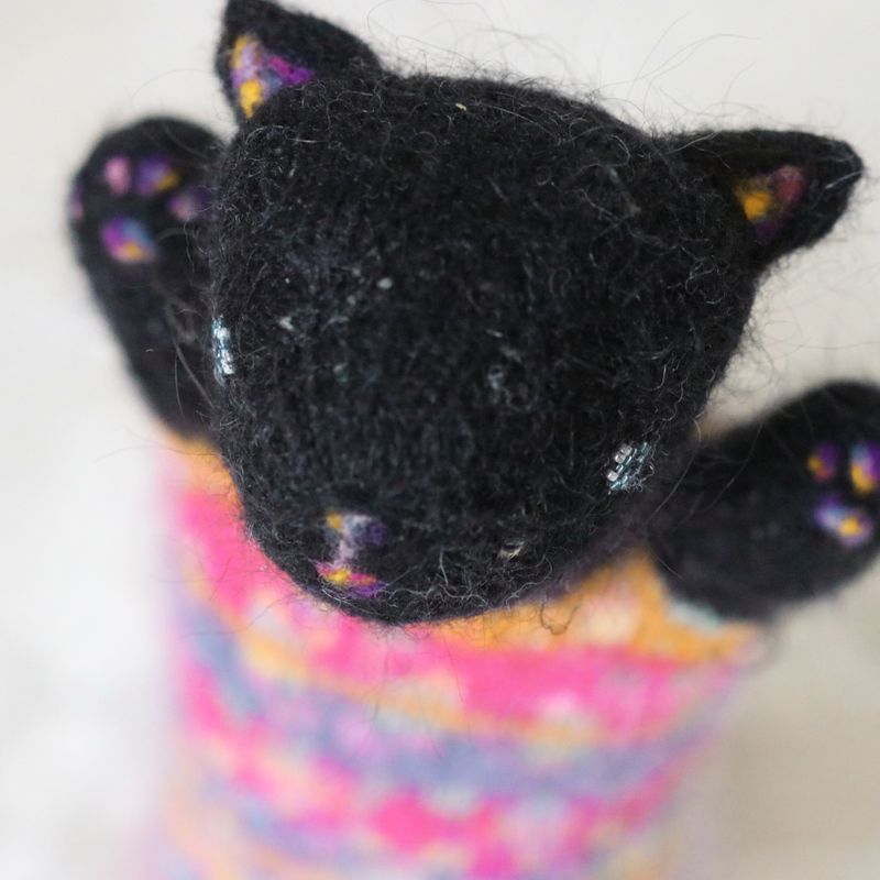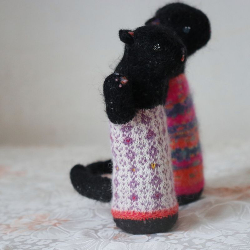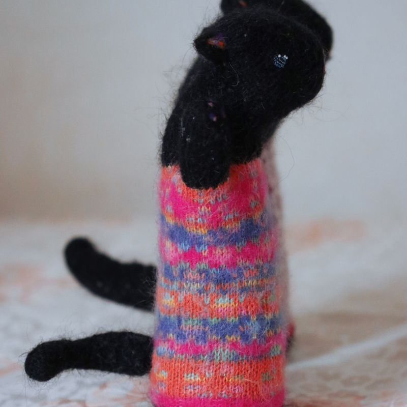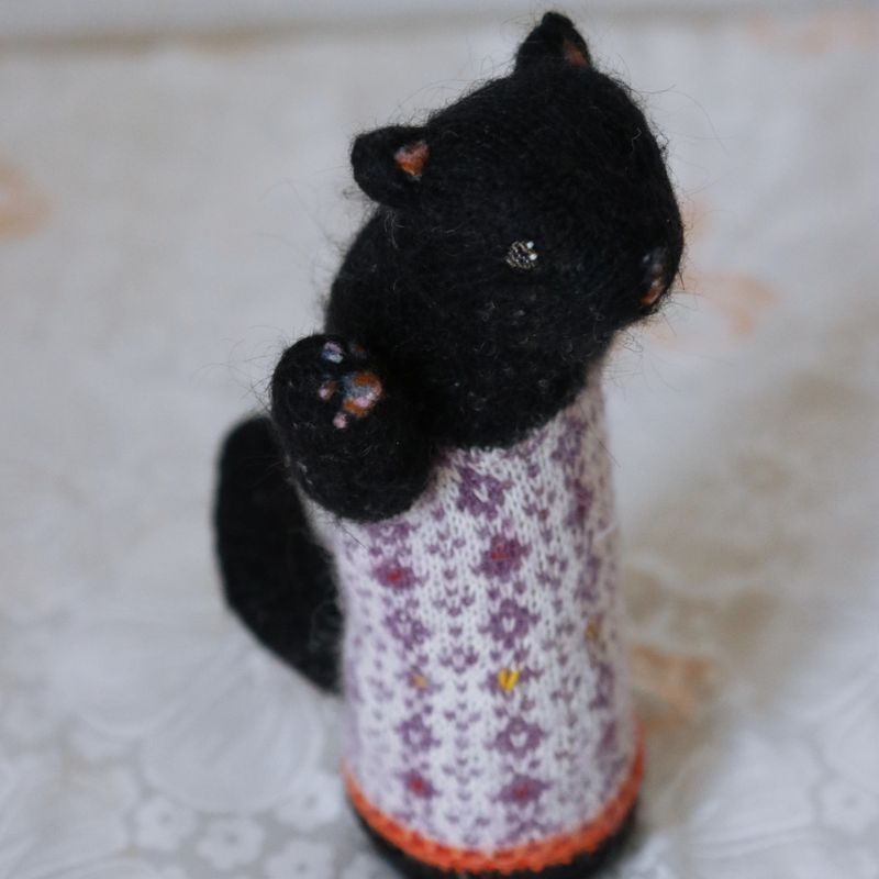 9" tall, 4" long. They are made to order:) The little kittens are so naughty! Be ready to clean all the time after their games. And hide your yarn! Before it´s too late. If you need someone to wreck your appartment and you cannot have a real cat - these little daredevils are here for you:) And when you expect it the least you find them so loving and wanted to be cuddled - so confusing. Just like the real cats:) The little kittens contain an orgonite knitted safely inside of them. Orgonites are known for their ability to reduce electromagnetic pollution and decrease effects of geopathogenic zones. They are made of almost all natural fibers mostly mohair, alpaca and wool. Stuffing is made of pure fleece. Face is needle felted with eyes sewed from Japanese Toho Beads. They can be washed in a washing machine on hand-wash cycle. After washing stretch them into their original shape:)