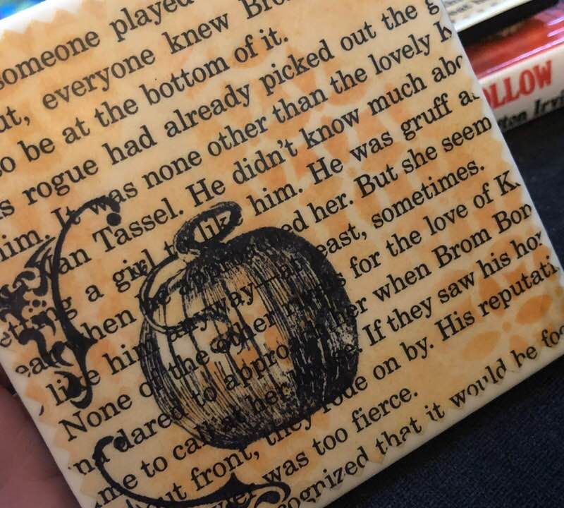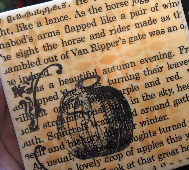 I used an autumnal orange ink on the page, adding a black pumpkin and accents. Edged in black. My coasters are handmade with sturdy ceramic and from what I like to call "rescue books". They come from thrift shops, garage sales, and basements. I give your favorite tales a second life by allowing them to be used in a different and unique way in your home. They are thoroughly sealed to ensure water-resistance from glasses and bottles. Each has feet made of slices of recycled wine corks to protect your tabletop. To clean, damp-cloth the surface