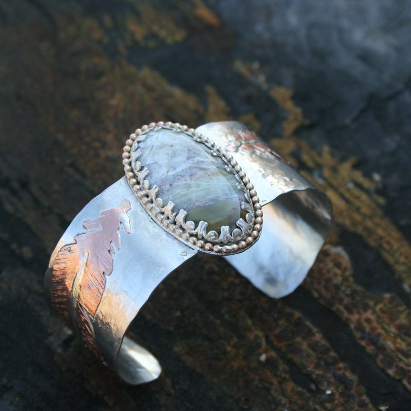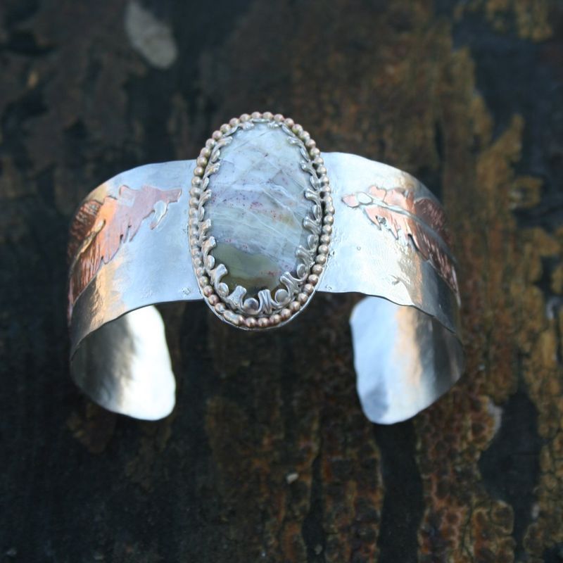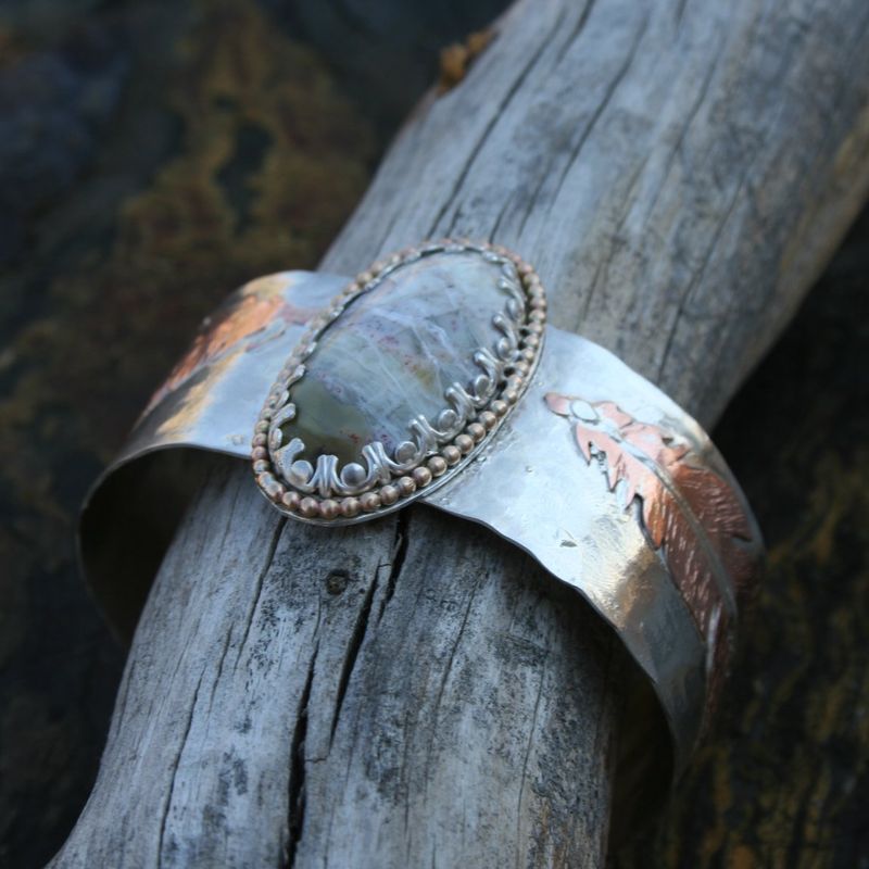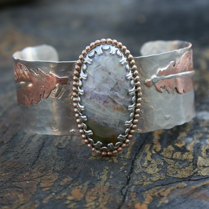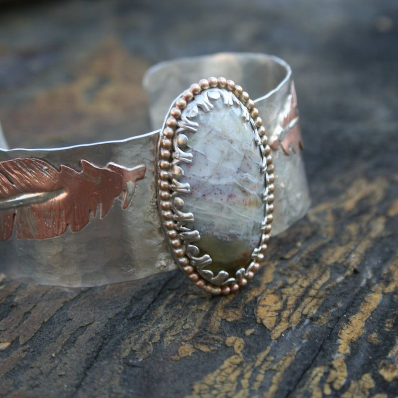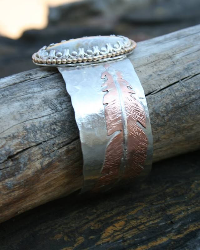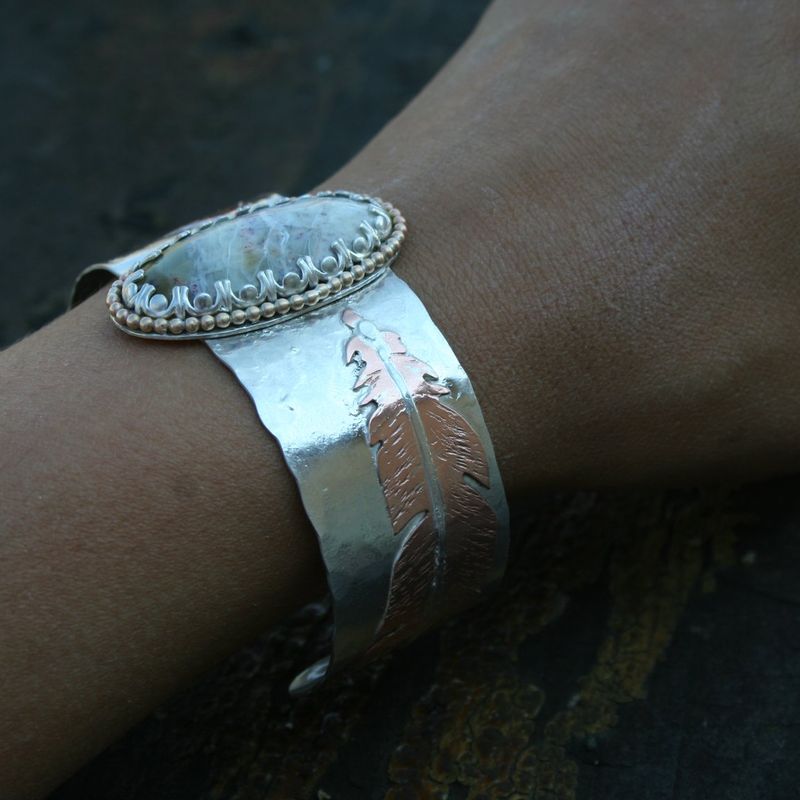 The "Light as a feather" cuff NEW Cuff bracelet going up in the shop! This cuff is absolutely super. Sterling silver with copper and sterling silver hand cut feathers. The center stone is a mystery Agate, with amazing detail and color. 14k gold filled round ball wire accents the stone perfectly. 6x1"