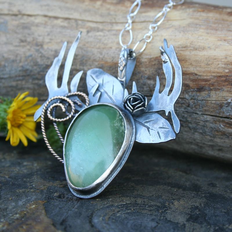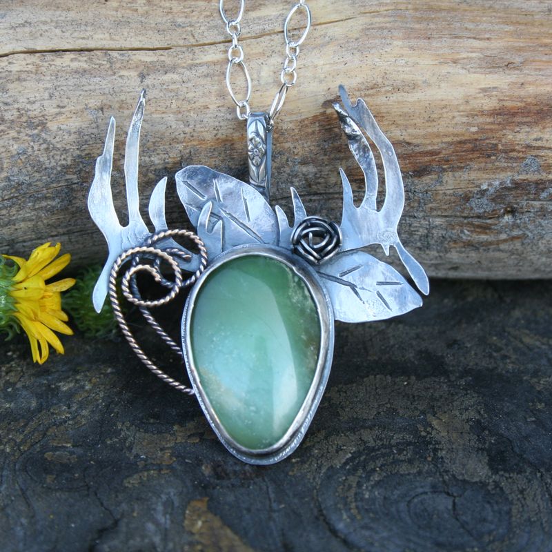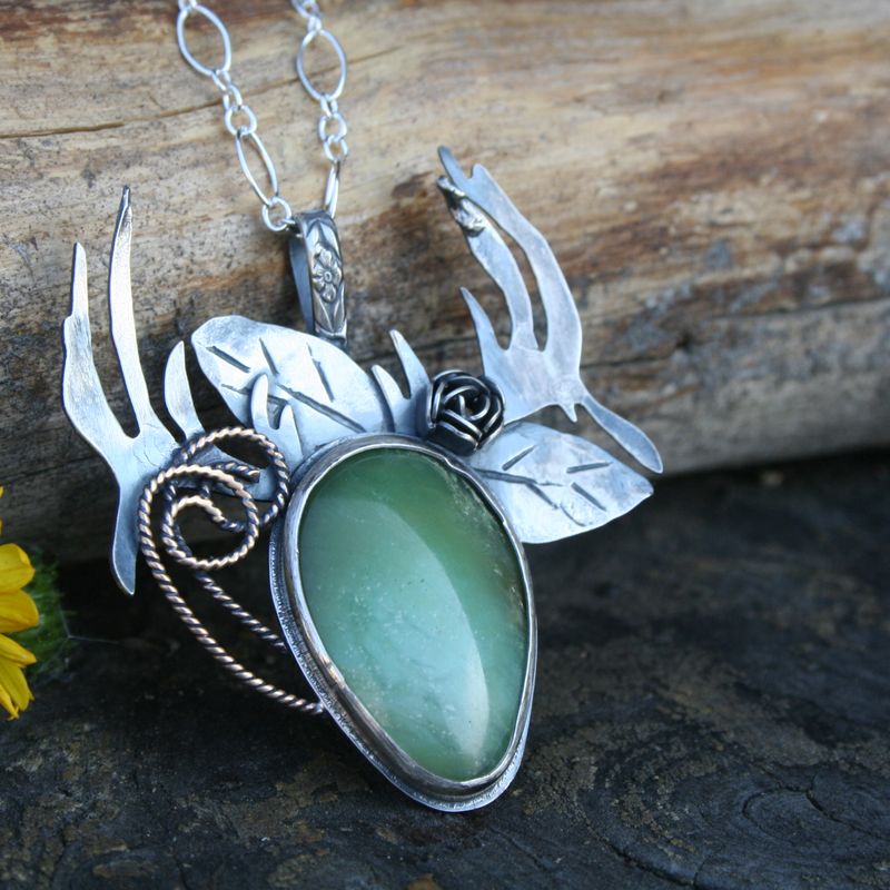 This pendant is another take on our Huntress penant. A gemmy green Variscite stone is front and center in this Deer Mount style piece. Hand cut antlers, hand made flowers, and hand made leaves accent the "face" and add a dreamy look. This piece is for the ladies who love the creatures of the forest as much as the forest itself. 2x2" Comes on the 20" sterling chain as shown