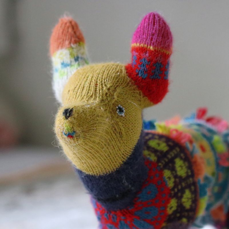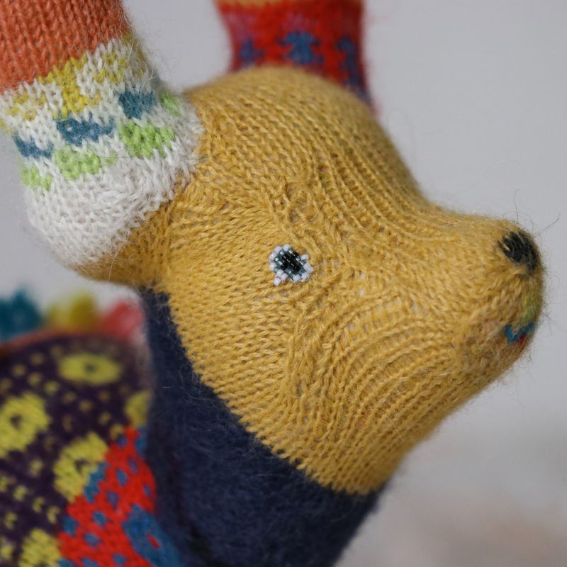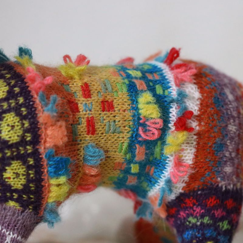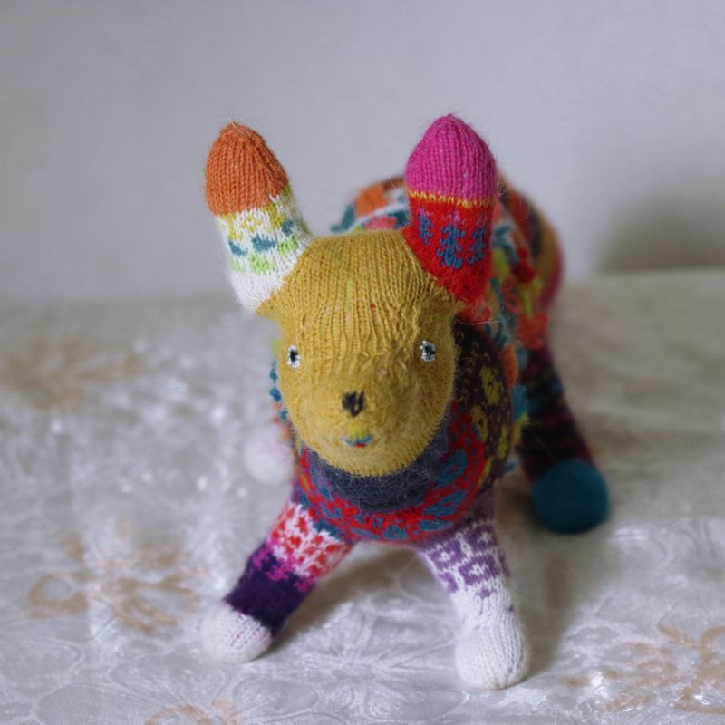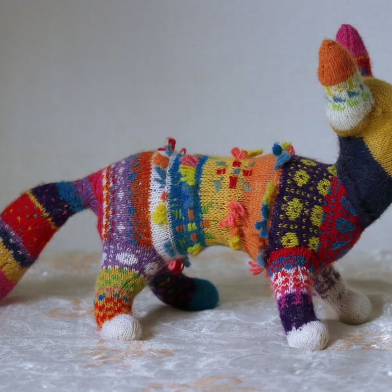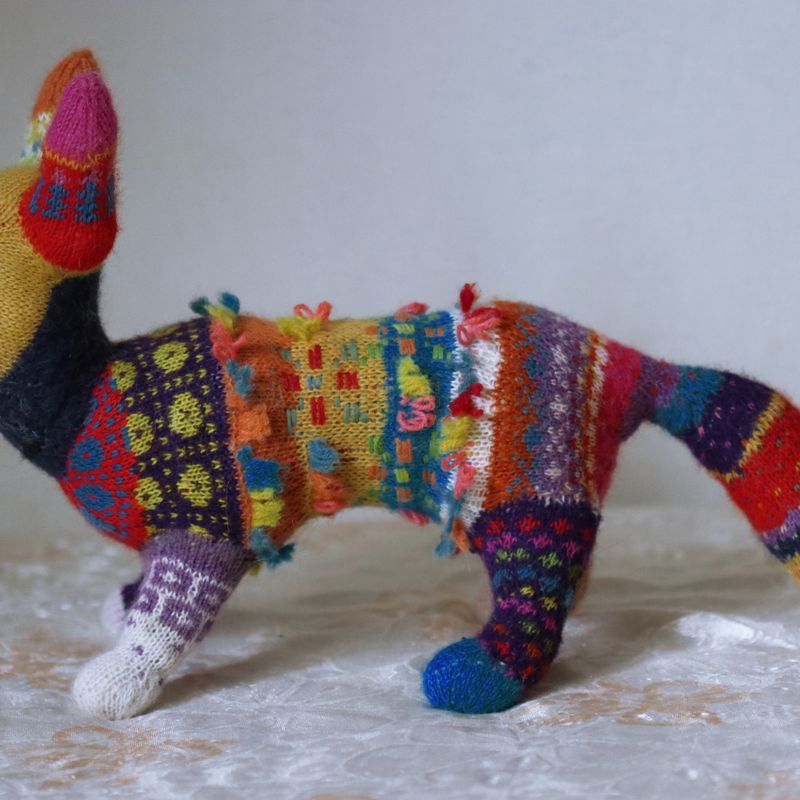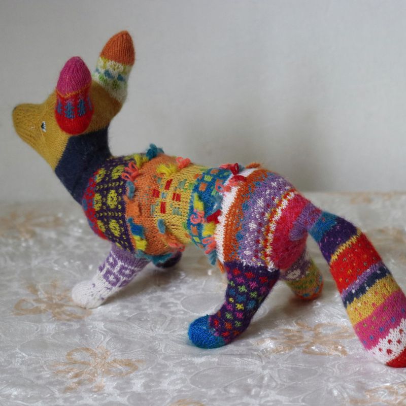 18"long, 10"tall She is two-thirds of a fox and one-third of chinese luck dragon. Wherever she goes grey turns into a rainbow. Lucky, lucky fox. She is made of almost all natural fibers mostly alpaca and wool. Stuffing is made of pure mohair. The patterns are traditional estonian folk costume patterns. She can be washed in a washing machine on a hand-wash cycle.