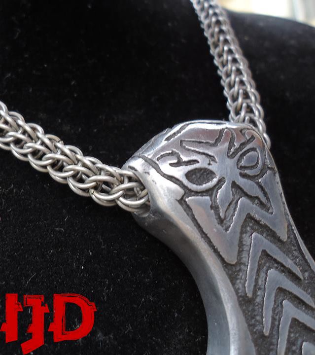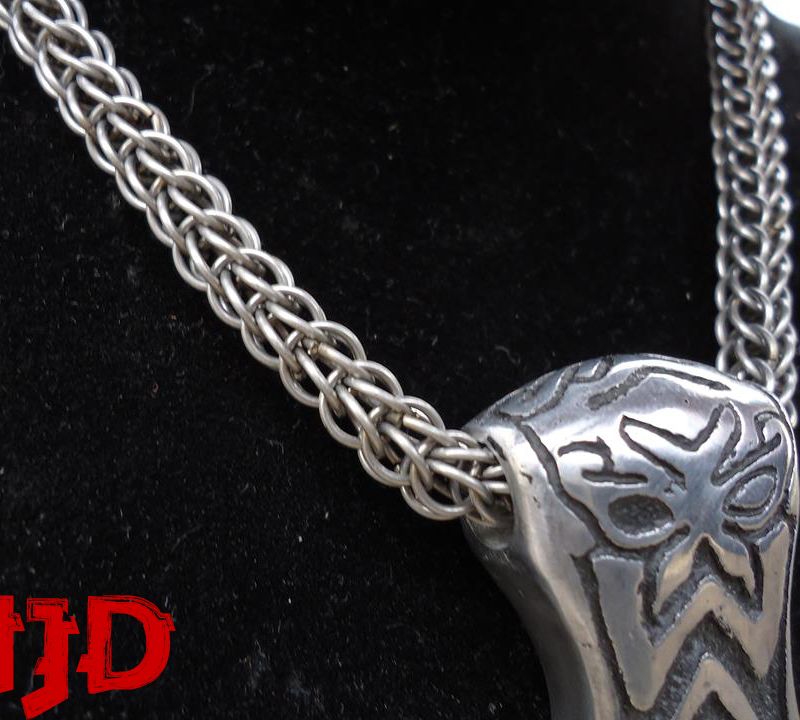 A beautiful Thor's hammer necklace, the pendant s hand made from aluminium, sturdy and polished to perfection, it never loses its color. The chain is handmade from stainless steel jump rings, woven in a full Persian style. Any part can be personalized, just write me a pm here and Ill grant your wishes 🙂