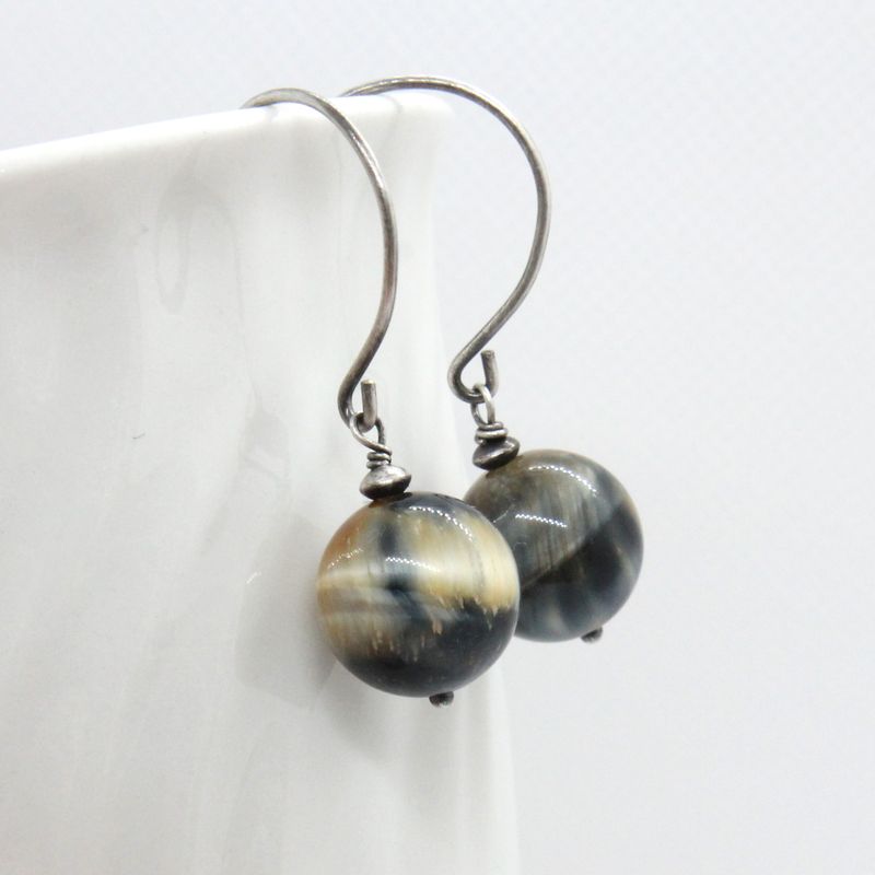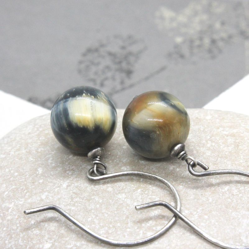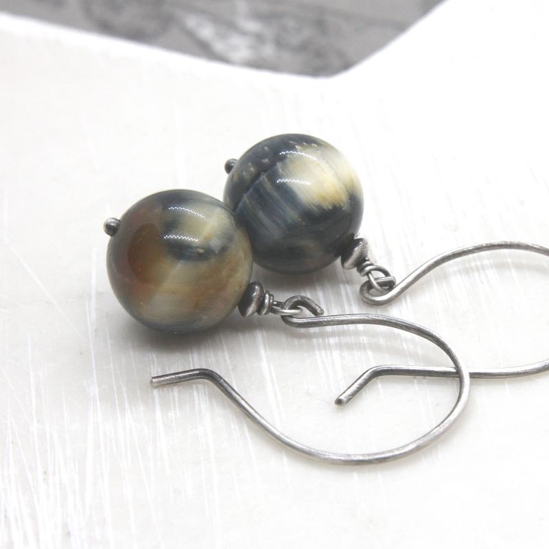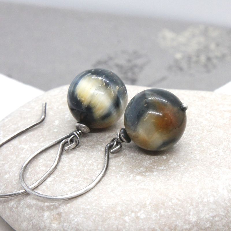 Tiger eye earrings made with round, smooth beads, in blue and golden shades. They dangle from my handmade, round ear wires. The metal is sterling silver, which I`ve oxidized, brushed and polished. Tigers eye are 12 mm Total lenght is 1.6 inches (40 mm)