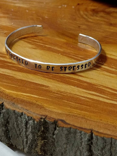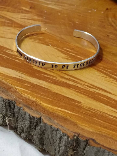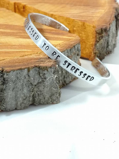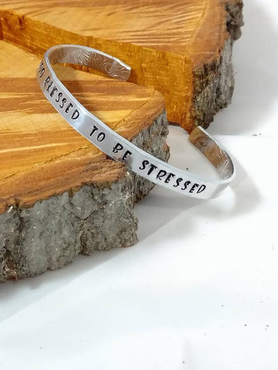 A gorgeous wearable bracelet with a wearable, Inspirational and motivational saying. The perfect reminder, that we are Too Blessed To Be Stressed, no matter what gets thrown at us, we can carry on. This would make a great gift for Mom, Daughter, Grandma, Aunts, Friends and even Co - Workers! It can be worn casually or go perfect with a dress also. Remember Cuffs do not touch end to end, so leaving a space in the middle is what looks best, especially for putting it on and removing. Materials: Aluminum Cuff Bracelet, Stamped by hand using Alphabet and design stamps. 1/4 x 6 Inch 14 Gauge Embossed Floral Bracelet.