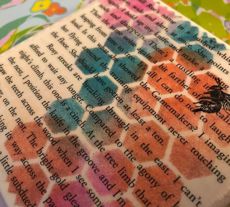 This set of four features pages from The Hunger Games describing the incident with the tracker jackers. I used a wasp stamp and a vibrant honeycomb pattern, unique to each tile, edged with orange. My coasters are handmade with sturdy ceramic and from what I like to call "rescue books". They come from thrift shops, garage sales, and basements. I give your favorite tales a second life by allowing them to be used in a different and unique way in your home. They are thoroughly sealed to ensure water-resistance from glasses and bottles. Each has feet made of slices of recycled wine corks to protect your tabletop. To clean, damp-cloth the surface. To purchase, please visit lemonlady.etsy.com
