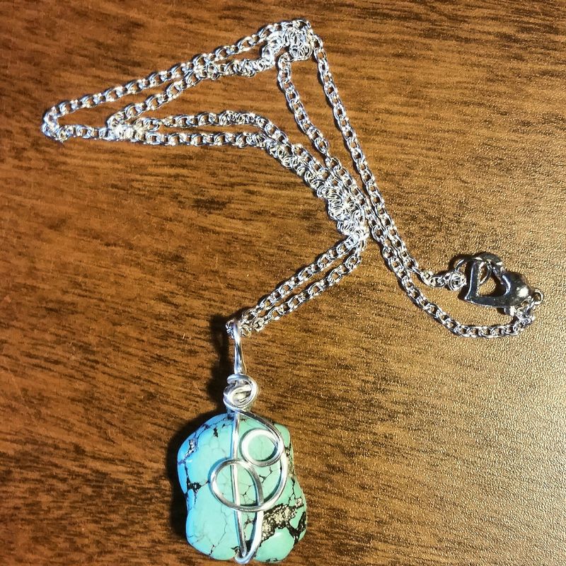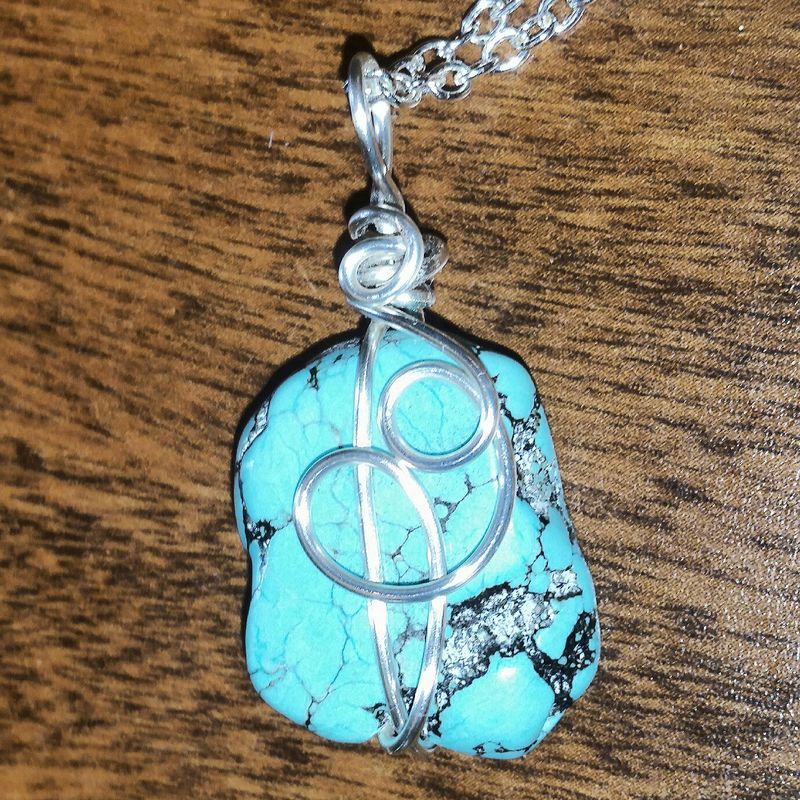 Silver plated wire sculptured with genuine turquoise nugget bead. Shiny silver loops adorn the front of the setting, with a silver scroll along the bail. Hung from 17 inch silver plated chain, with sterling silver heart shaped clasp. Polished to perfection. A stunning, one of a kind necklace sure to get you noticed!