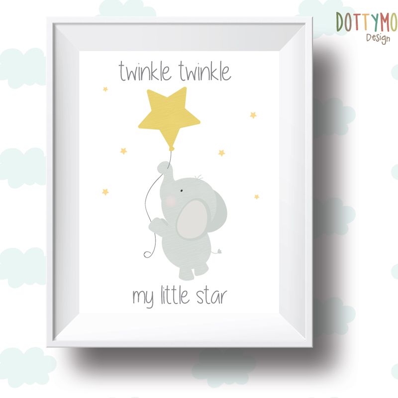 Twinkle twinkle little star elephant - print INSTANT DOWNLOAD-DIGITAL FILES ONLY If you do not have access to a printer, I'm happy to print and send via post, please contact me for details. Nursery printable wall art, print features a sweet elephant holding a yellow star balloon, with wording, twinkle twinkle my little star , with a white background, perfect for a little ones room or nursery, or given as a gift. Perfect for new baby gift and nursery decor. -FILES INCLUDED- 5" x 7" JPG file format-1 print. 8" x 10" JPG file format-1 print. 11" x 14" JPG file format-1 print. *If you would like alternative sizes or the PDF file to resize, please email me and i will be happy to send for no extra cost..* If you would like alternative colours to the ones listed, please email me. No physical item will be shipped , frames are for decorative uses only. Print quality will depend on paper and printers used. If you are not entirely happy with your purchase, please message me, where i will be happy to help, my main priority is that you are satisfied and 100% happy. All artwork is copyright of Dottymoondesign © By purchasing this artwork you are not acquiring the copyright, and any form of duplication or distribution is prohibited. Used for personal use only.. Thank you...