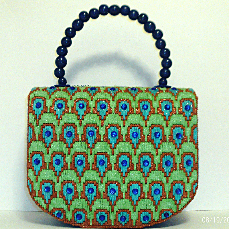 A unique and one of a kind large Royal Blue and Green Peacock Handbag,all Jeweled and hand painted