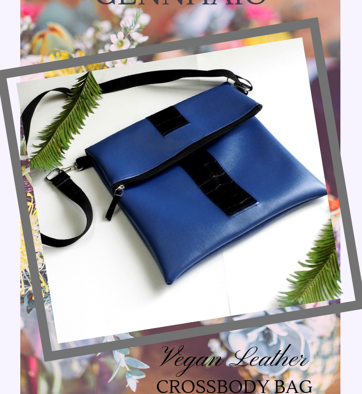 Foldover Crossbody Bag made from vegan leather and gently repurposed materials. This medium size bag is a convenient size, large enough to hold a 14” computer. The adjustable strap allows the bag to be comfortably carried on the shoulder or across the body. A functional and stylish bag, which is practical for everyday use throughout the year. Clean with a damp cloth will keep this bag looking crisp and pristine. Size: (W)13" x (H) 8x (D) .5”. Available from my Etsy shop https://www.etsy.com/shop/Gennhaio