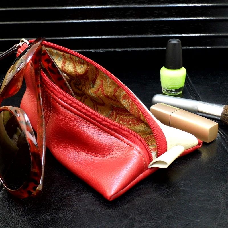 Vegan Leather Cosmetic Bag, Red Triangle Pouch, Small Pyramid Pencil Case, Soft Sunglasses Case, Cream Makeup Bag, Upcycled Pouch