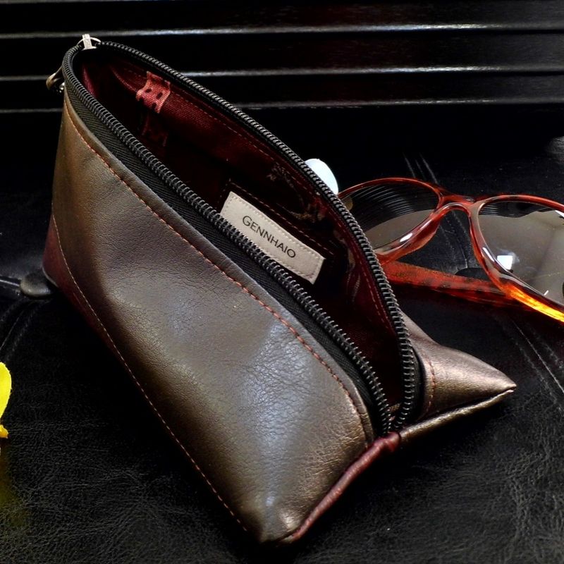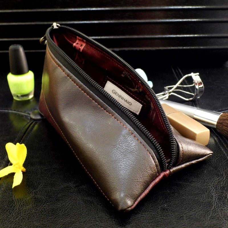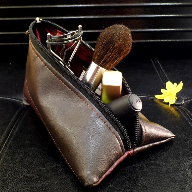 Brown Vegan Leather Makeup Bag, Vegan Pouch, Small Triangle Cosmetic Pouch, Mini Toiletry Travel Bag, Sunglasses Case