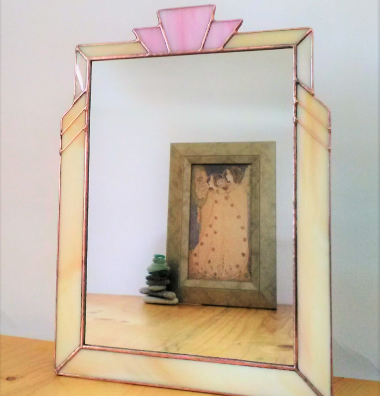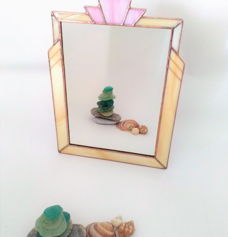 A wall mirror in the Art Deco style, suitable for any room in the house. Can be customised to match your own home decor. Stained glass in a light, wispy pink for the focal point, at the top, which is met on both sides by an iridescent, light amber border and continues into opaque light amber for the main border. SIZE top of detail to base 18.5 x 25 cm (7+1/4" x 9+3/4"), mirror section 14 x 20 cm (5+1/2" x 7+3/4") GIFT IDEA This is ideal as a housewarming or anniversary gift or just for yourself in colours to complement your own interior design style. Thin wire has been used for the side focal points, where the borders meet. The mirror backing has a hanging plaque attached, which can be used with a standard wall hook, and the back of the mirror is protected by a sheet of padding. COLOURS It's available in silver coloured or copper-patina solder lines. If you would like it to be made in different coloured glass, just send me a message. HANDMADE As it's a made to order item, please allow 14 days for production. SHIPS FROM the Czech Republic. All customs and tax duties are the responsibility of the buyer. Thank you for understanding.