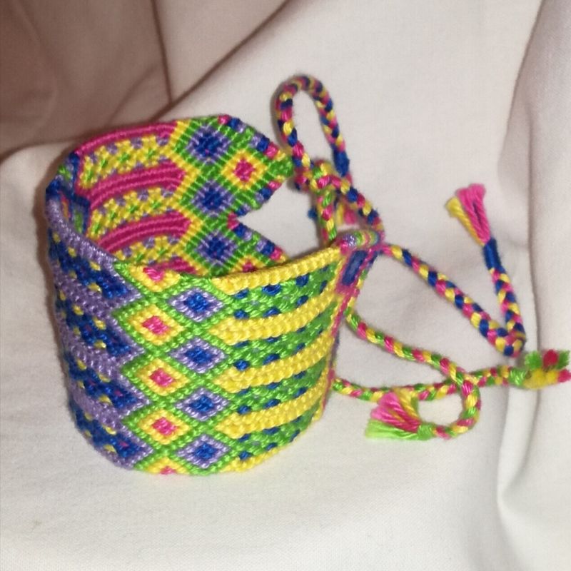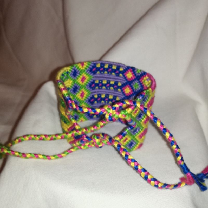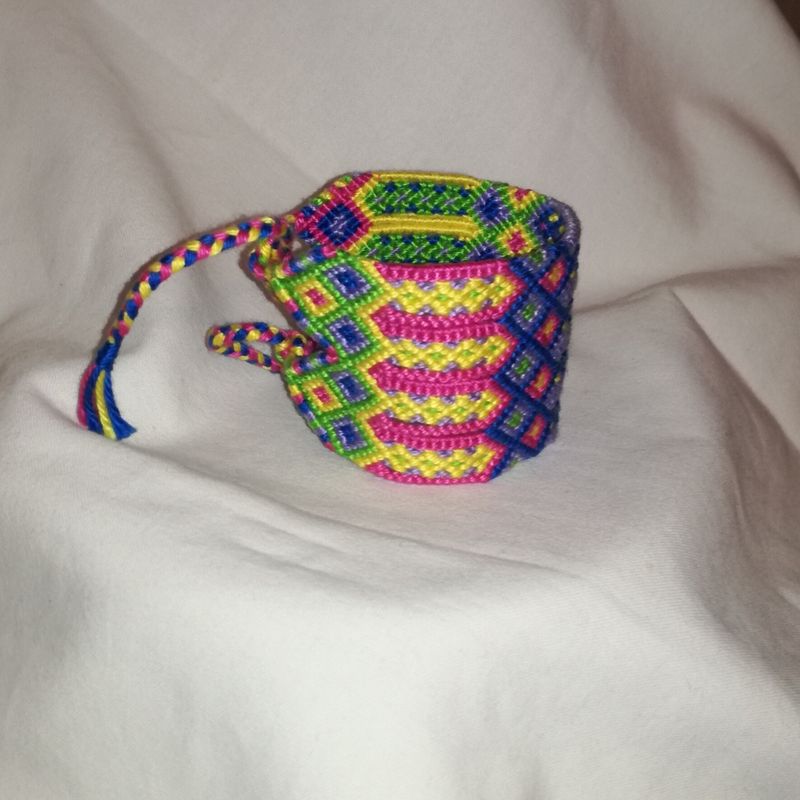Colourful knotted wayuu bracelet, braided with 40 cotton string. The width is 4.5 and length is 15.5 cm + braids in the end.