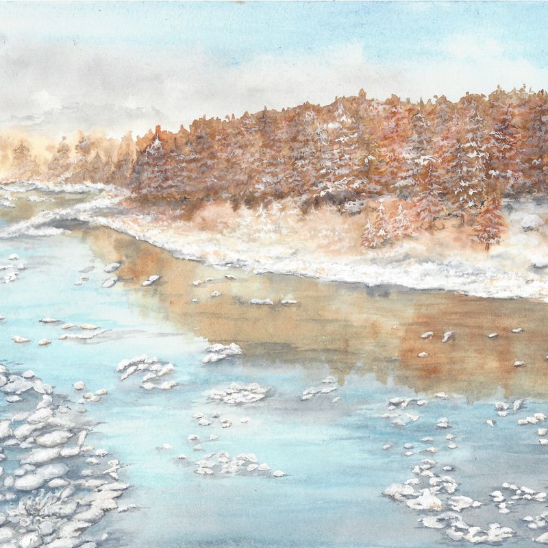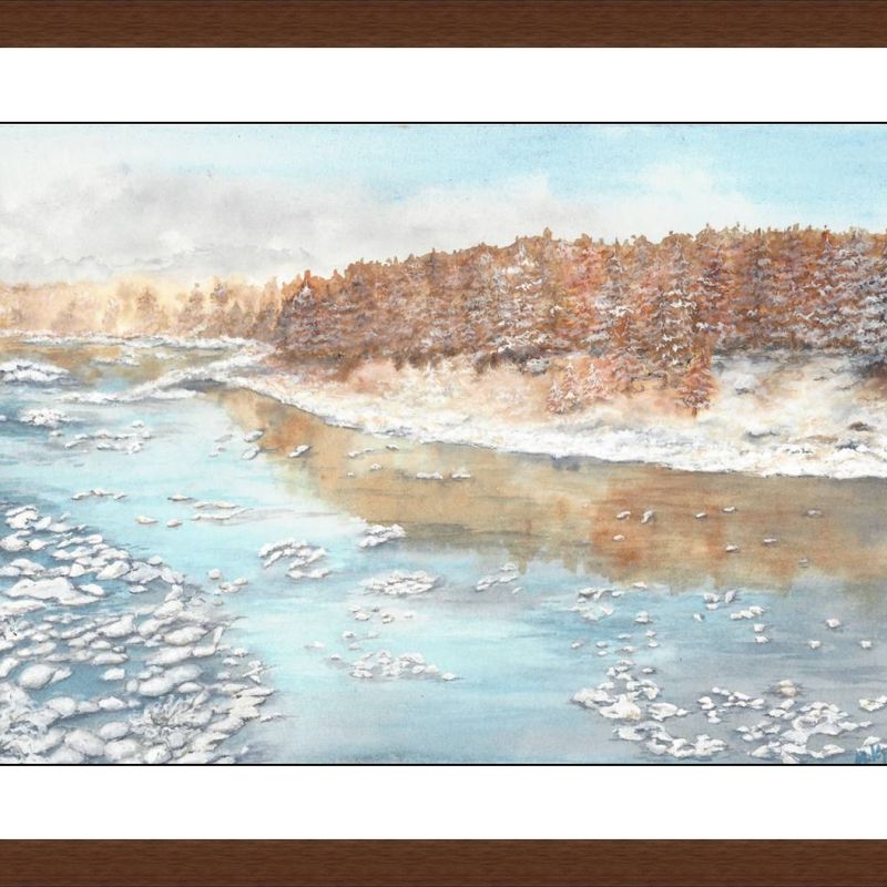 Winter landscape painting, snow river art, winter wall art